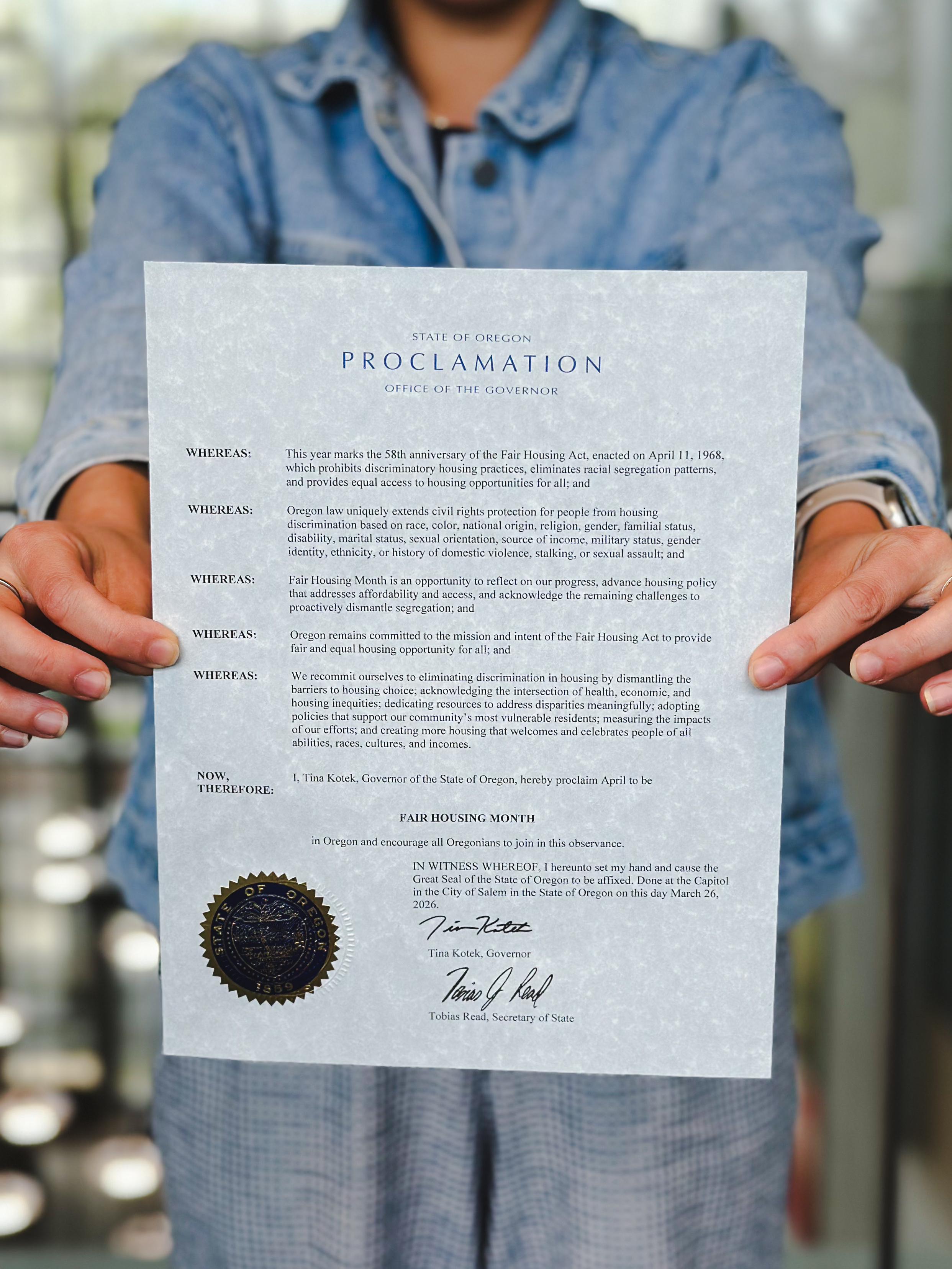 Gov. Kotek Proclaims April As Fair Housing Month (Photo) - 04/06/26