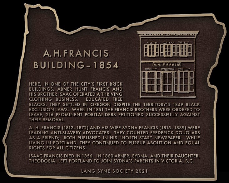 New Plaque Honors Black Pioneer Merchant A.H. Francis; Public Dedication On Saturday, September 18 At 4pm In SW Portland (Photo) - 09/15/21