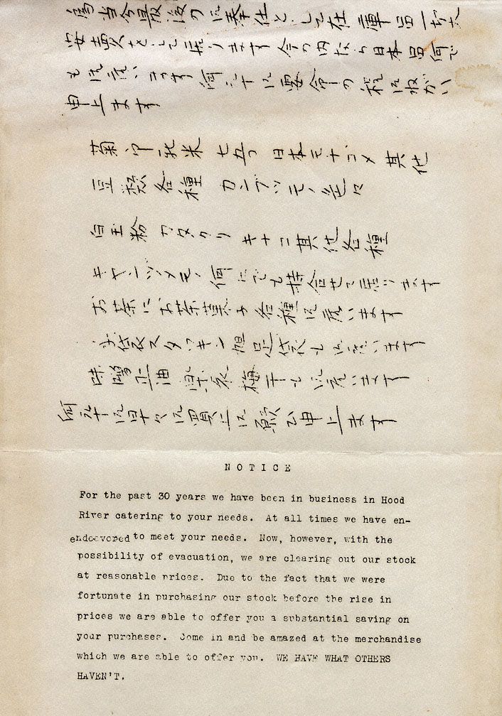The records document the experiences and contributions of businessman and noted community leader Masuo Yasui, Homer Yasui’s father, and his family of first- and second-generation Japanese immigrants who lived in Hood River, Oregon, during the first four decades of the twentieth century. Masuo Yasui operated the Yasui Brothers’ Store with his brother, Renichi Fujimoto, for more than thirty years before they were forced to close it permanently following President Franklin D. Roosevelt’s signing of Executive Order 9066 in February 1942, which allowed the U.S. Army to forcibly remove all Japanese immigrants and Japanese Americans from the West Coast and incarcerate them in camps. In Oregon, 3,714 people of Japanese descent were rounded up and sent to the Heart Mountain Relocation Center in Wyoming, the Minidoka Relocation Center in Idaho, and the Tule Lake War Relocation Center in northern California.