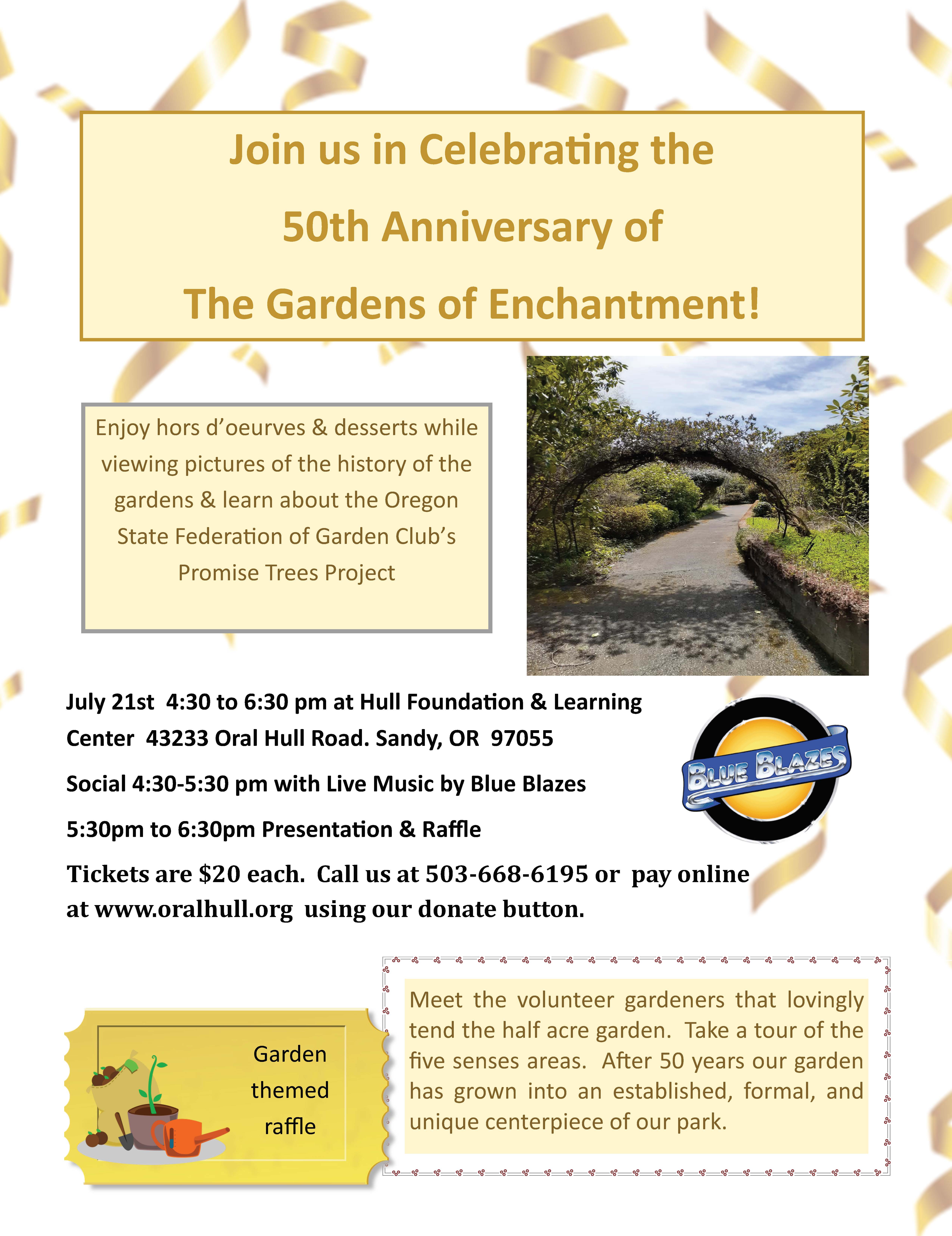 Enjoy snacks and beverages while you learn about the Gardens' history as well as the Oregon State Federation of Garden Clubs' Promise Trees Project. Mingle with the volunteer gardeners that lovingly tend to the Gardens of Enchantment and visit the "five senses" area of the property.