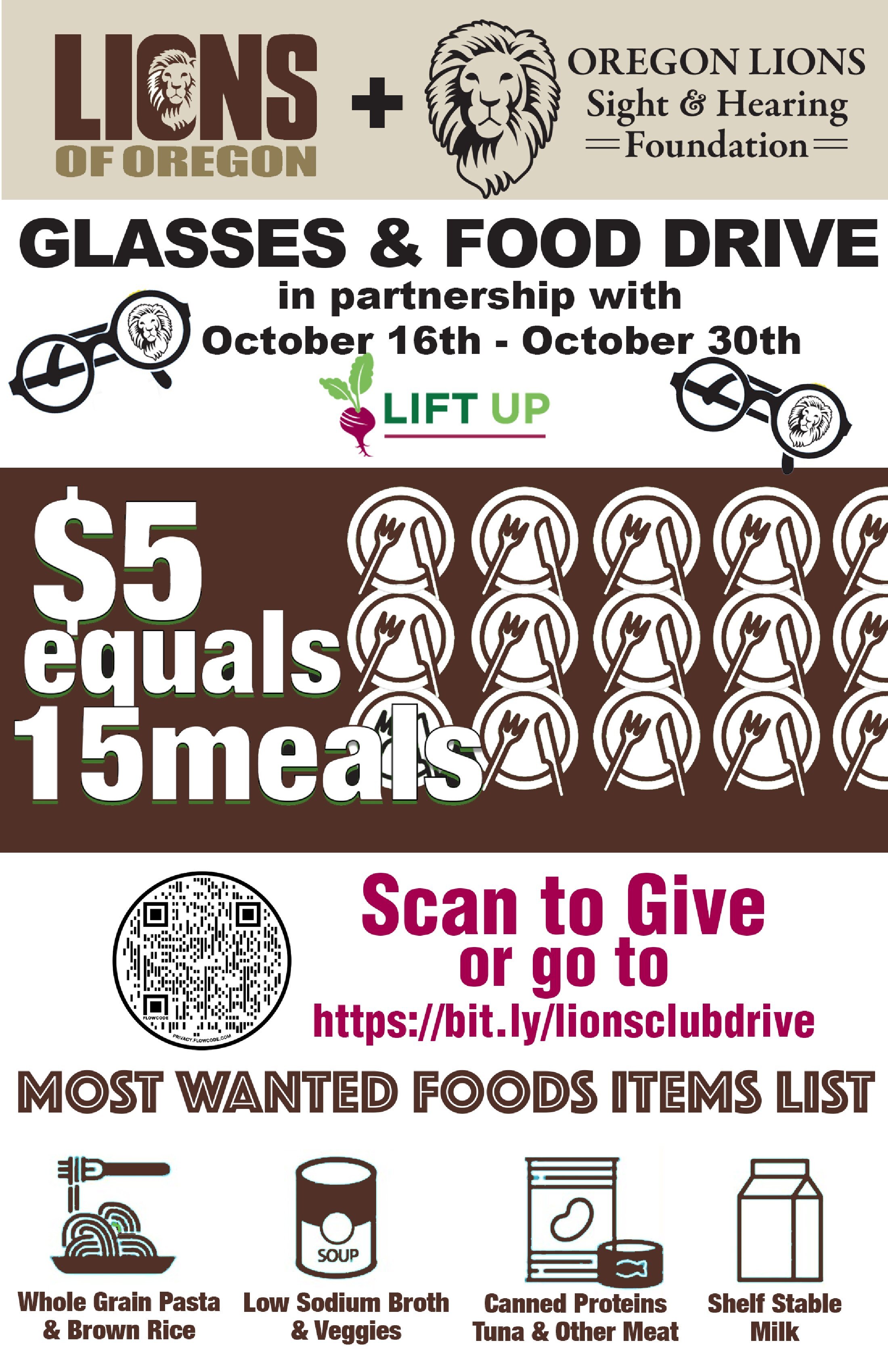 Portland, OR - From October 16 to the 30th, you can make a difference for the neighbors in your community! The Lions Clubs in the Portland area, Oregon Sight & Hearing Foundation (OLSHF) and Lift UP are launching an eyeglass and diabetic food drive. Lift UP’s mission is to reduce hunger and improve the lives of low-income residents in Northwest and Downtown Portland. OLSHF's mission is to screen, treat, save, and restore sight and hearing, in partnership with Lions Clubs.