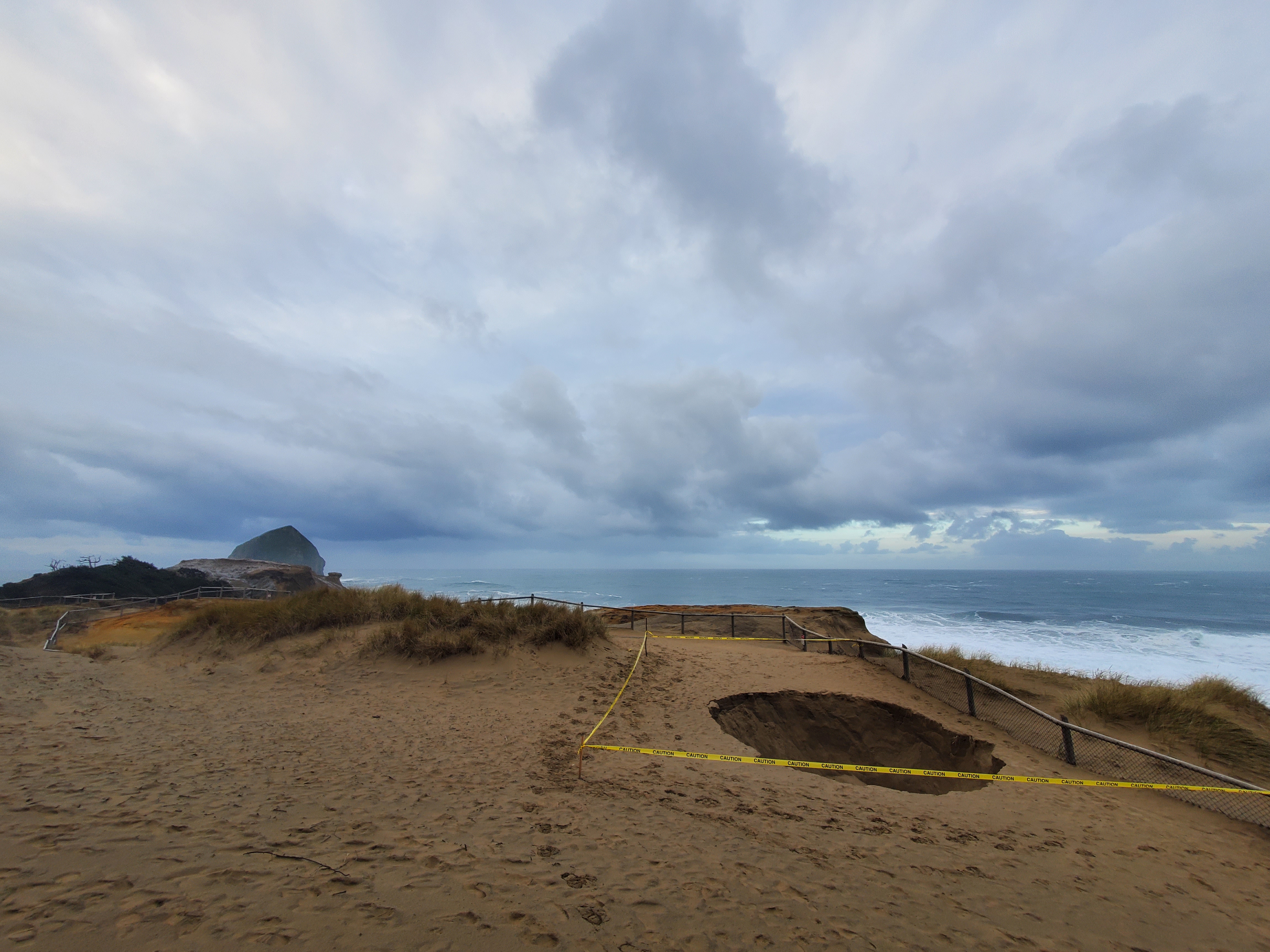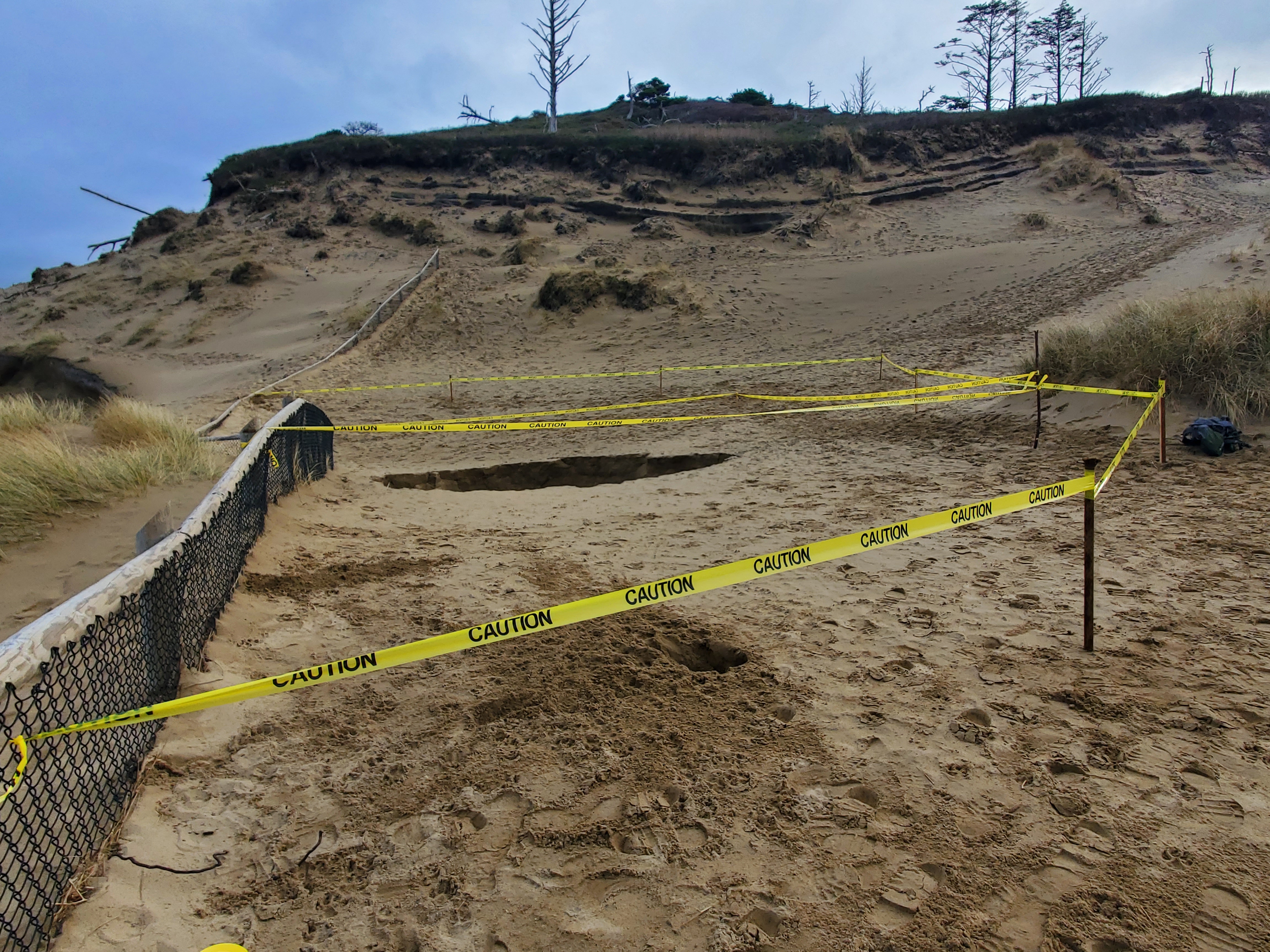 Even though the spot is marked with barriers, this hole could change at any moment, and others could appear. If you see something that concerns you, leave the area and report it to Cape Lookout State Park staff at 503-842-4981. In an emergency, call 911.