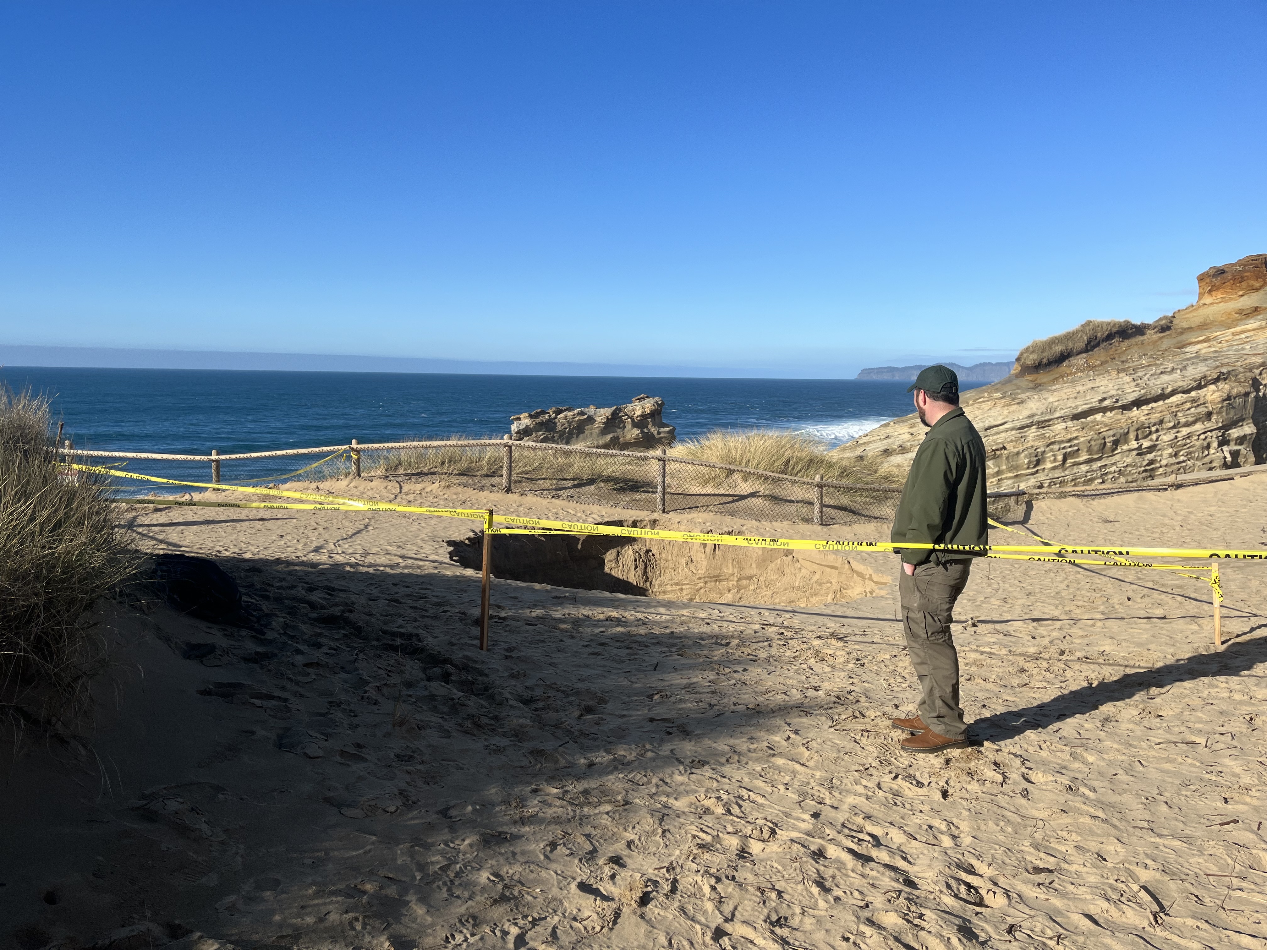 Oregon Parks and Recreation Department is looking into possible causes of the sink hole, and we are continuing to monitor the situation. We will share additional details as they become available.