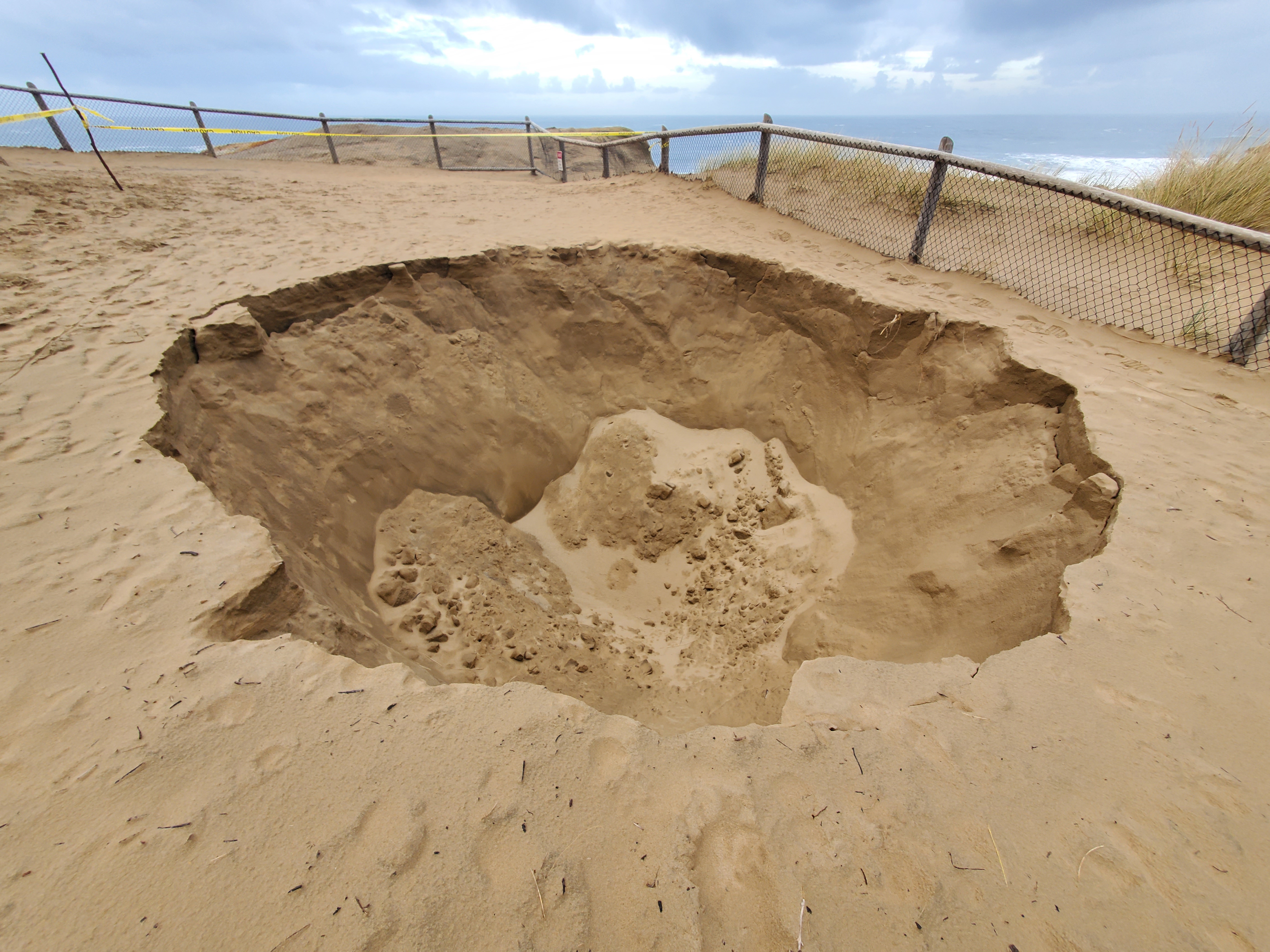 PACIFIC CITY, Ore— A small sink hole measuring 20-feet wide and 15-feet deep was discovered at Cape Kiwanda State Natural Area Sunday in the lower northwest corner of the dune.