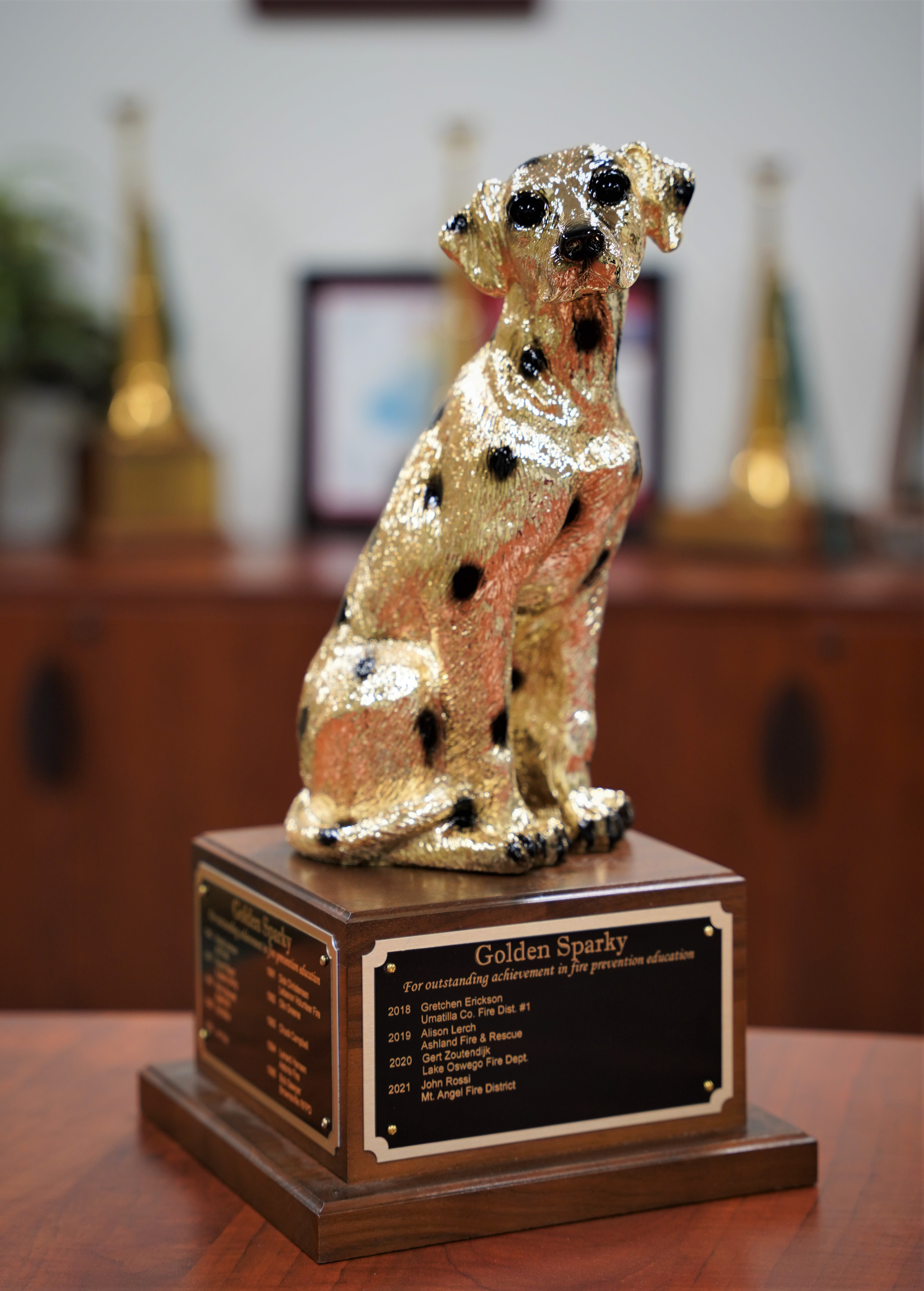 The Golden Sparky award recognizes a fire service member for outstanding achievement in fire prevention or public fire safety education. The Silver Sparky award recognizes a civilian for outstanding achievement in fire prevention or public fire safety education.