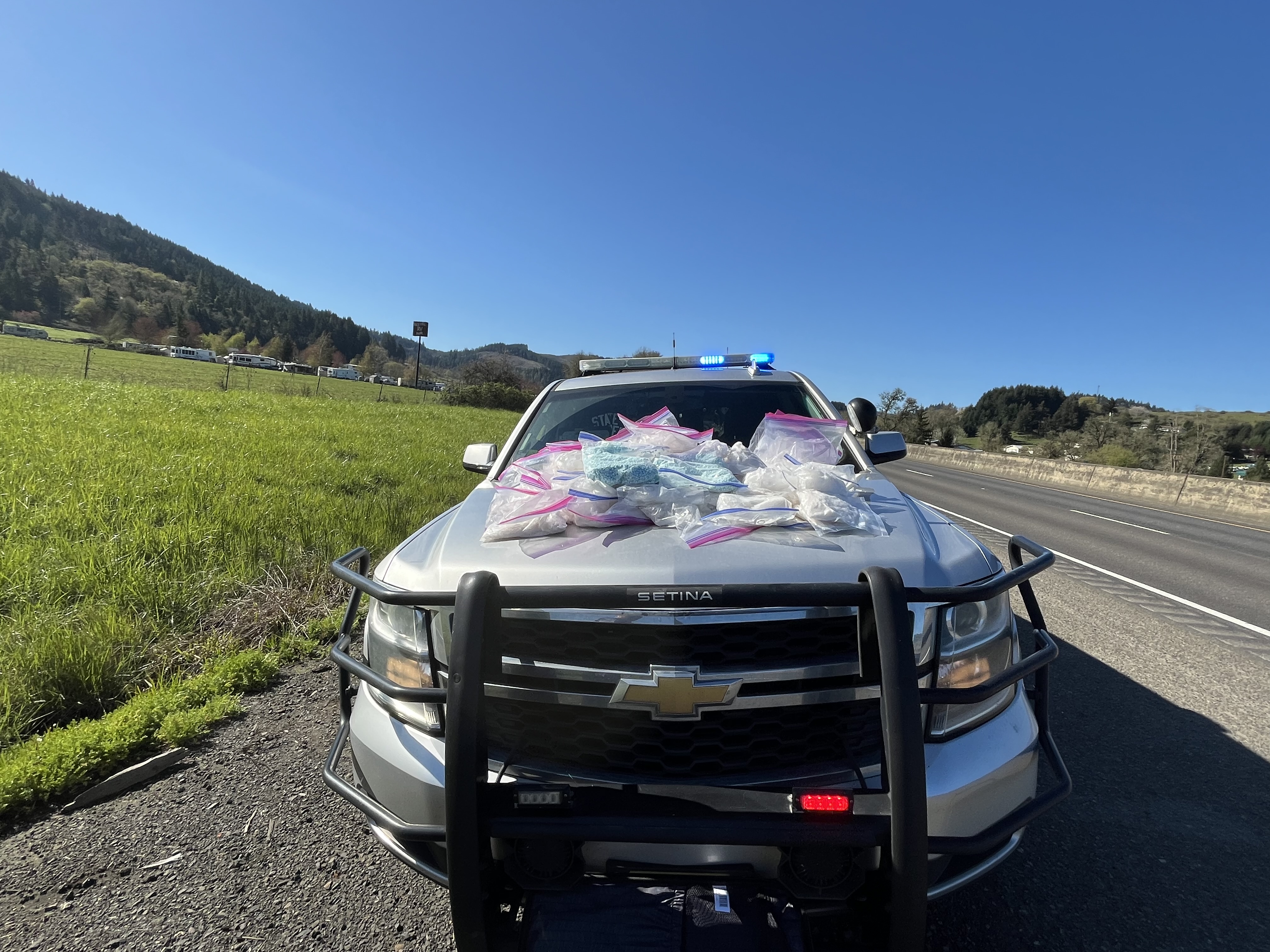 DOUGLAS COUNTY, Ore. 5 April 2024 – A recent traffic stop on Interstate 5 near Roseburg led to the seizure of large quantities of methamphetamine and fentanyl headed for the streets of Portland.
