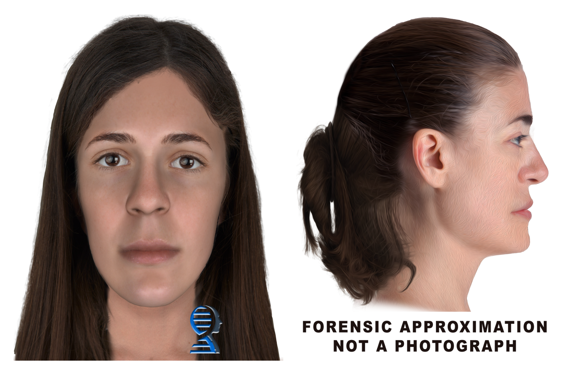 A Parabon NanoLabs DNA Snapshot Report, which utilizes genetic material to determine eye color, hair color, skin tone, and ancestry, was completed. The report predicted the individual was of European and Indigenous North American descent, with unfreckled fair skin, brown eyes, and brown hair. A rendering of her facial characteristics was created and used as her NamUs profile picture. A subsequent genetic genealogy report was completed in 2023, but did not produce any promising leads.