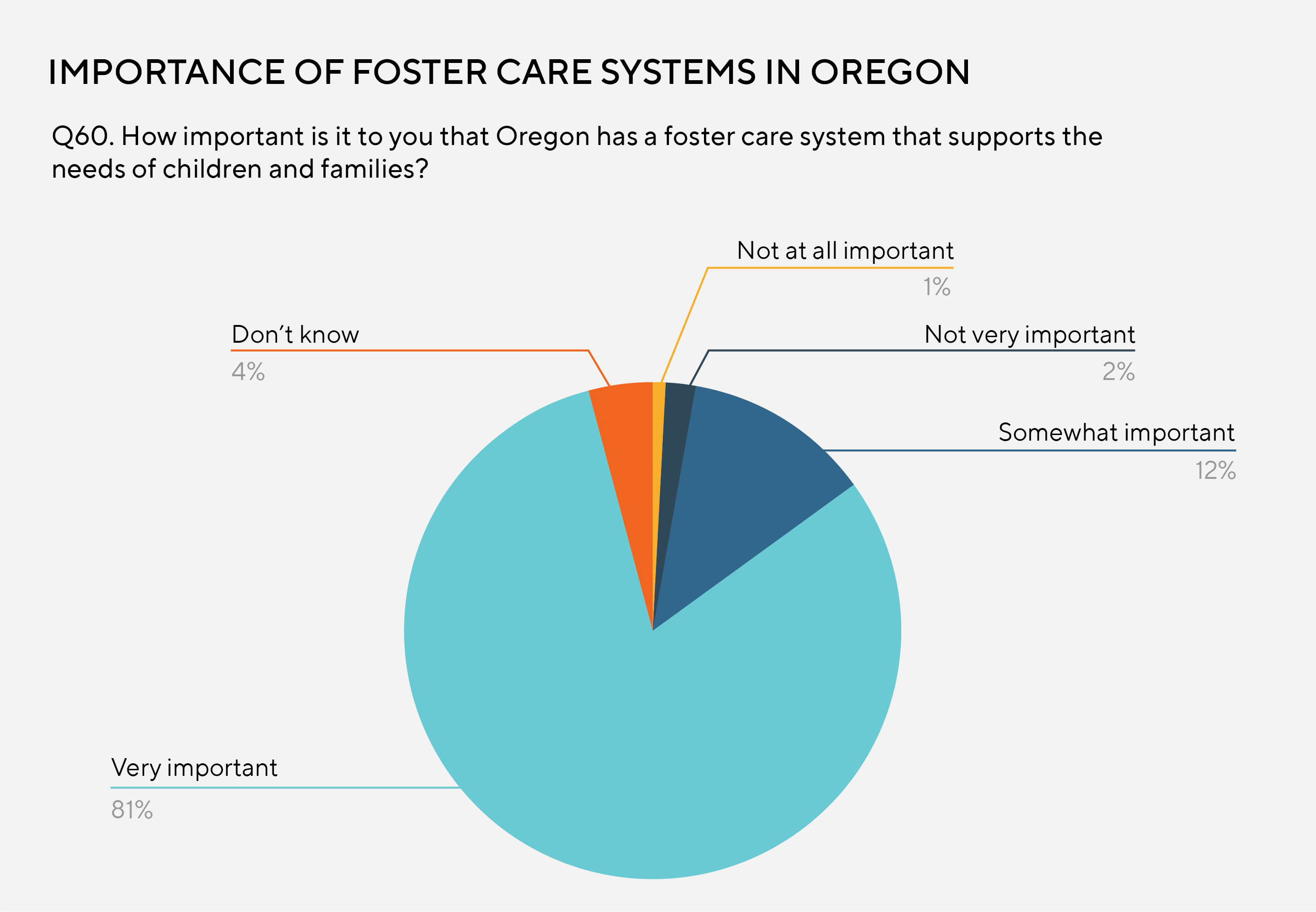 - Although about three in four Oregonians may not have personal experience with the foster care system in Oregon, a staggering 93% of respondents agreed on the importance of Oregon’s foster care system in supporting the needs of children and families (Q60).