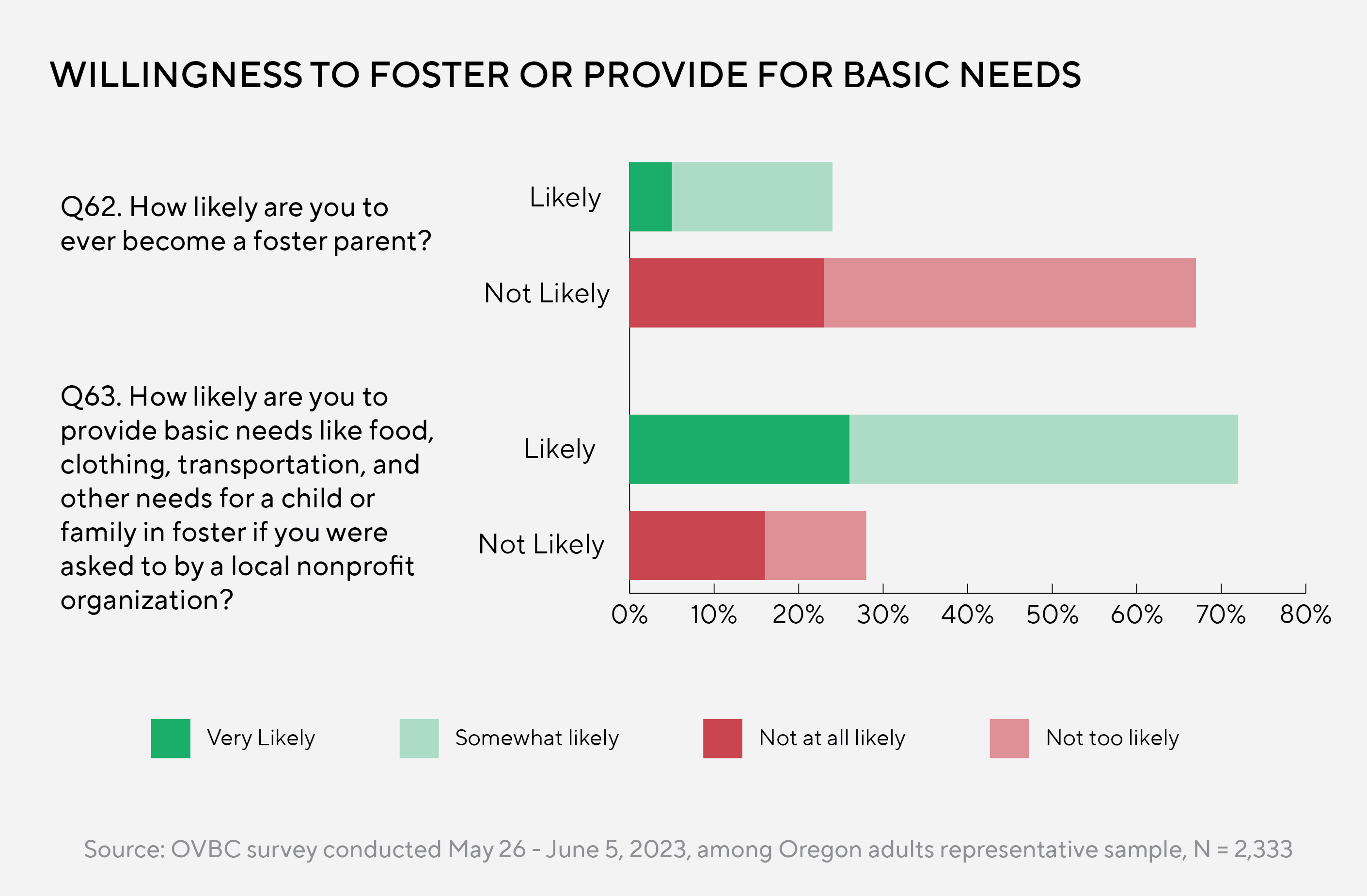 - Oregonians are more likely to provide basic needs like food, clothing, or transportation for a child or family in the foster care system (Q63). 72% of respondents said they would somewhat or very likely provide these basic needs when asked by a non-profit organization.