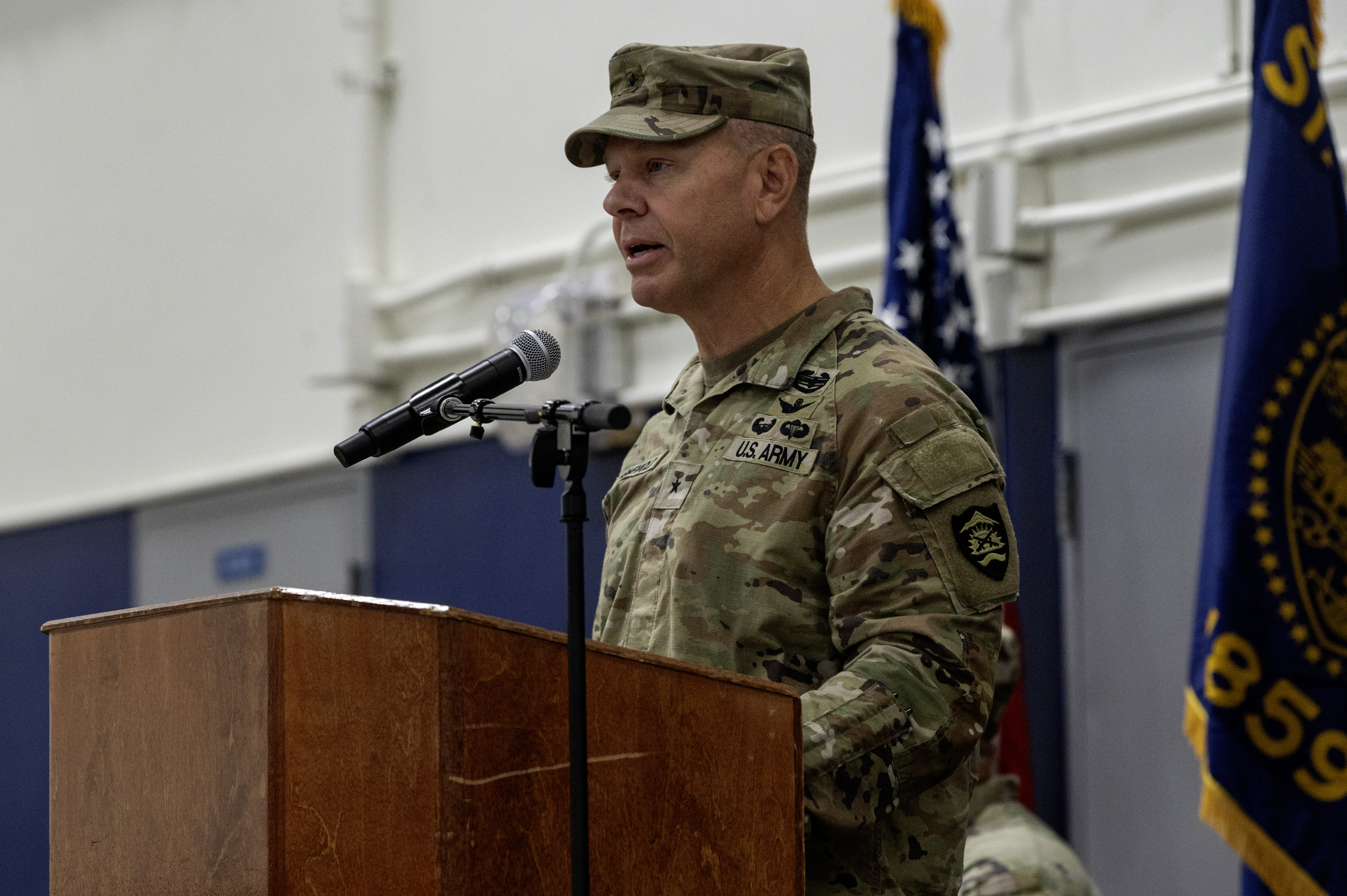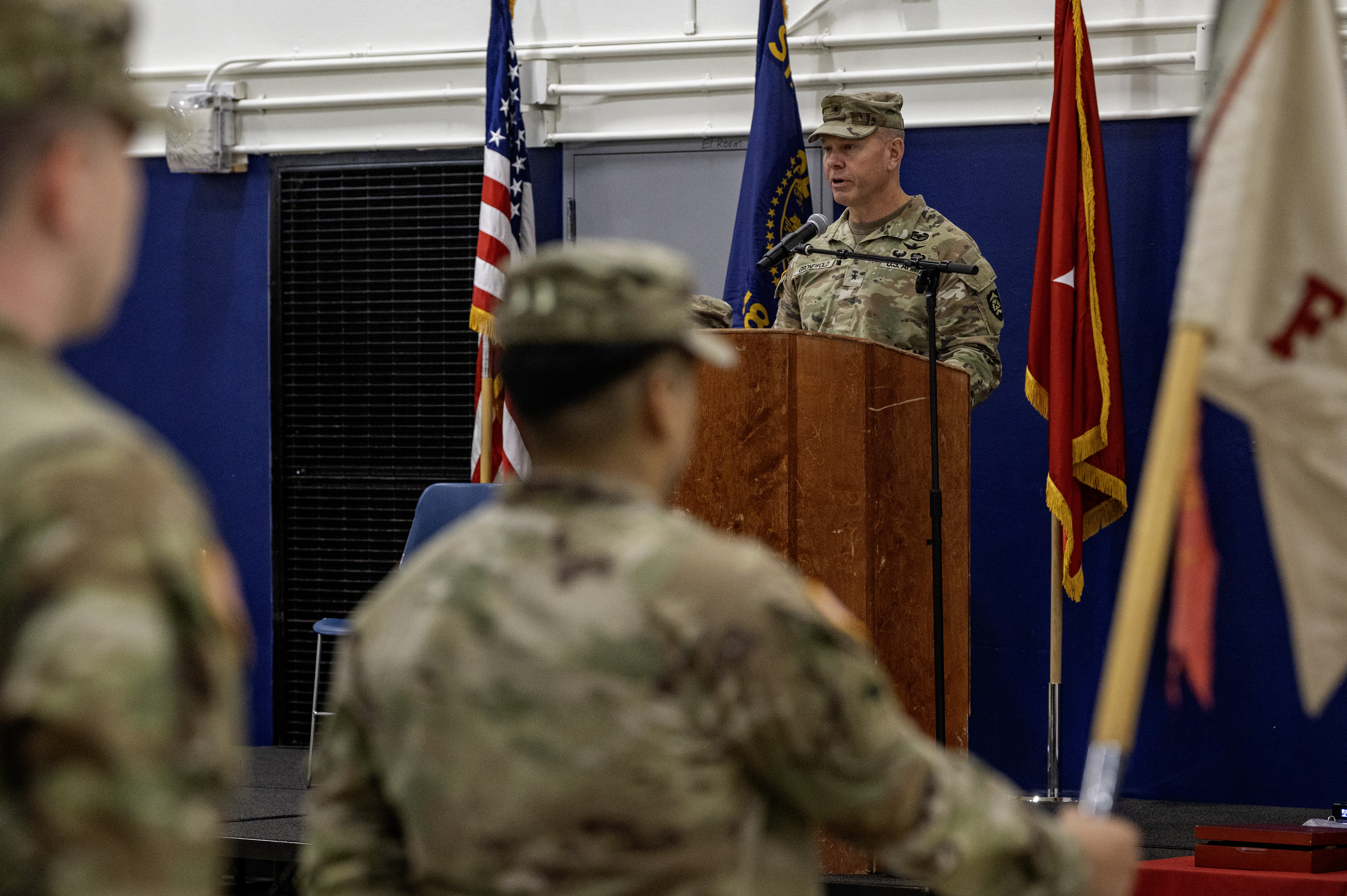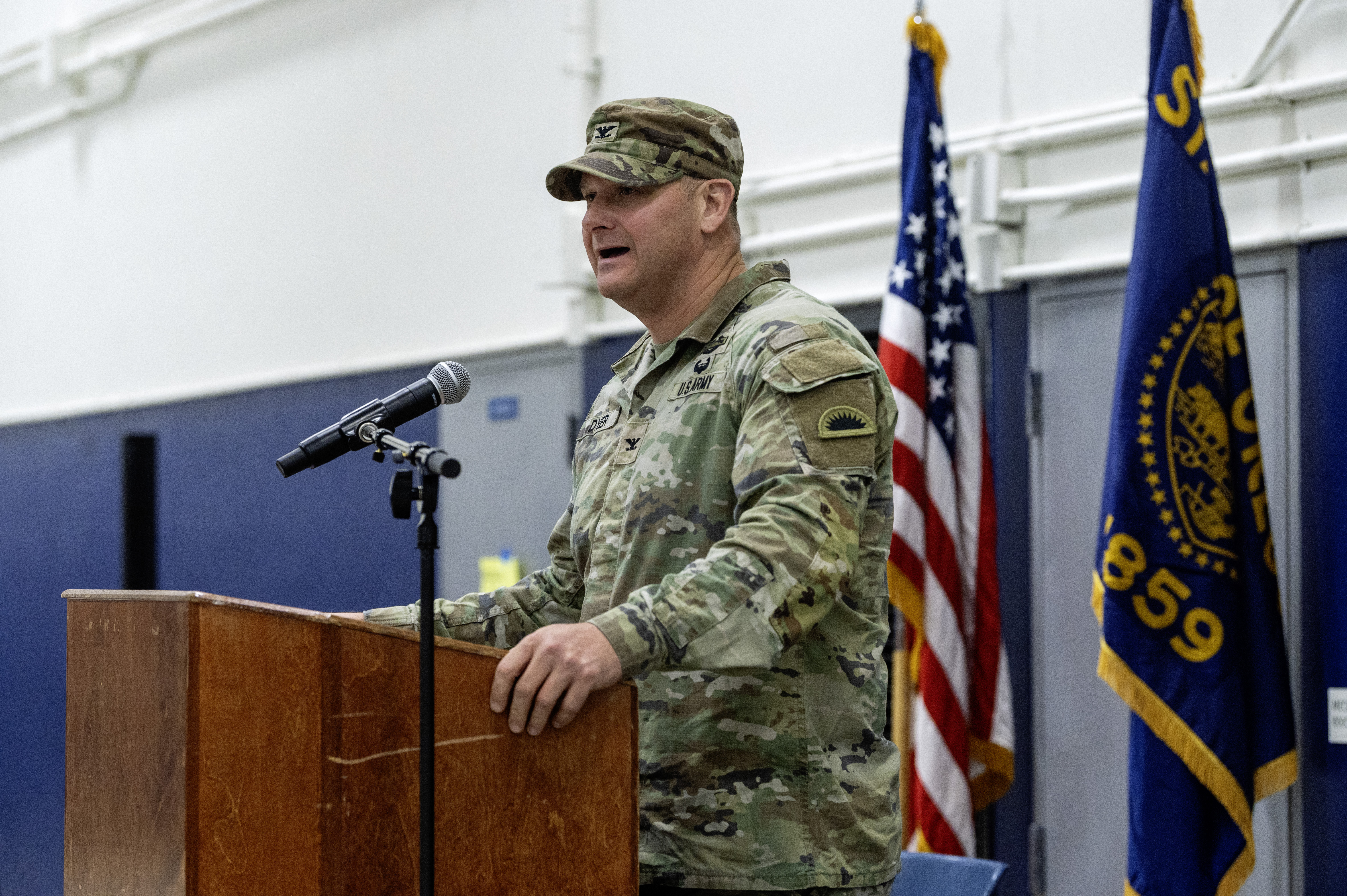 251116-Z-CH590-1118: Oregon Army National Guard Col. Paul Dyer, the 41st Infantry Brigade Combat Team Commander, delivers remarks during the Soldiers of the 2nd Battalion, 218th Field Artillery Regiment, along with their families, during their formal demobilization ceremony held on Nov. 16, 2025, at Neil Armstrong Middle School in Forest Grove, Oregon. Approximately 230 members of the unit deployed to support Operation Inherent Resolve at eight separate geographically dispersed sites in Jordan, Iraq, and Syria during their year-long mobilization. (Oregon National Guard photo by John Hughel)