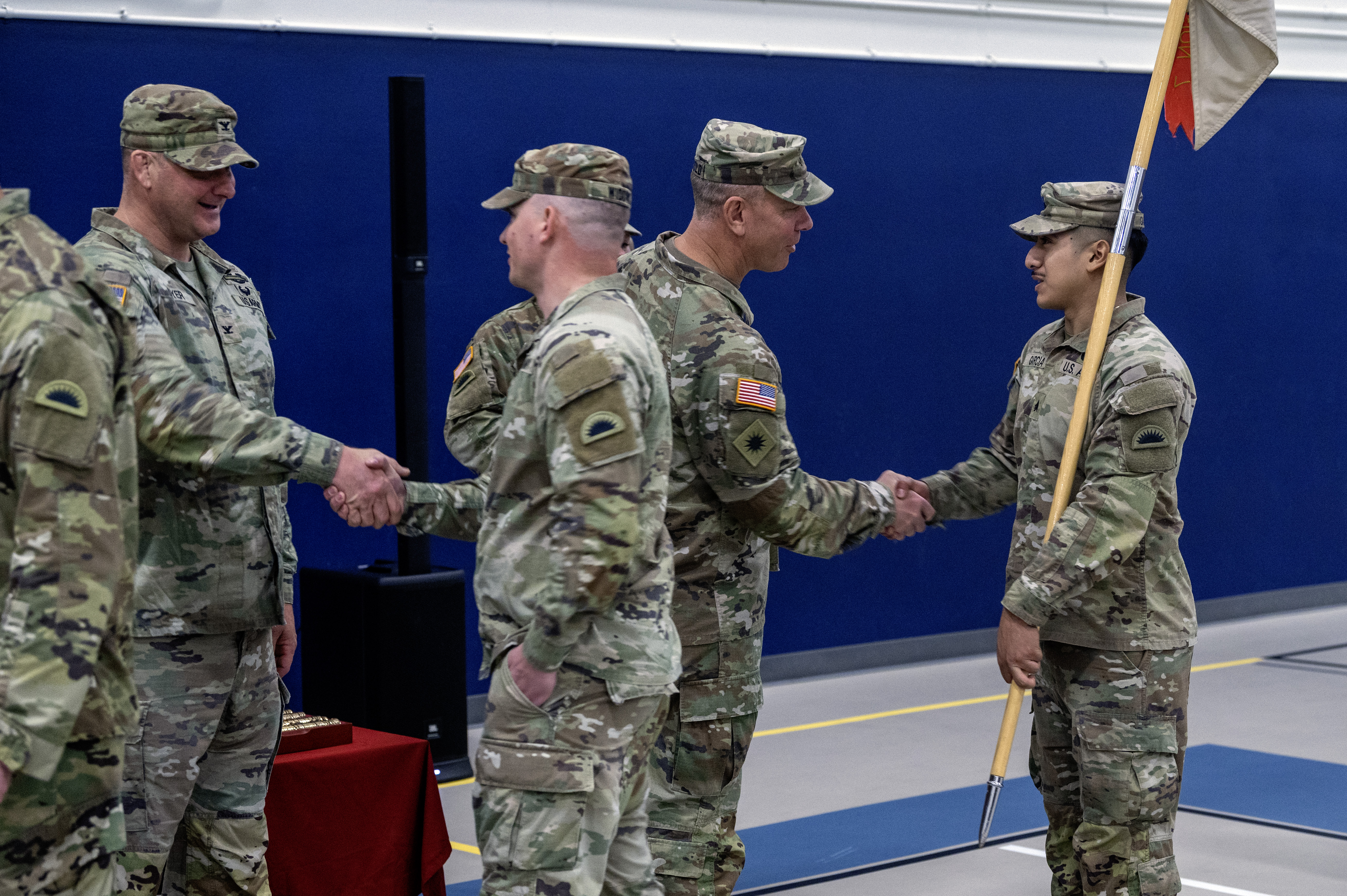 251116-Z-CH590-1163: Oregon National Guard Col. Paul Dyer, the 41st Infantry Brigade Combat Team Commander (left), and Brig. Gen. Alan R. Gronewold, Adjutant General, Oregon National Guard (right), greets and congratulates members of the 2nd Battalion, 218th Field Artillery Regiment following their formal demobilization ceremony on Nov. 16, 2025, held at Neil Armstrong Middle School in Forest Grove. Approximately 230 members of the unit deployed to support Operation Inherent Resolve at eight separate geographically dispersed sites in Jordan, Iraq, and Syria during their year-long mobilization. (Oregon National Guard photo by John Hughel)