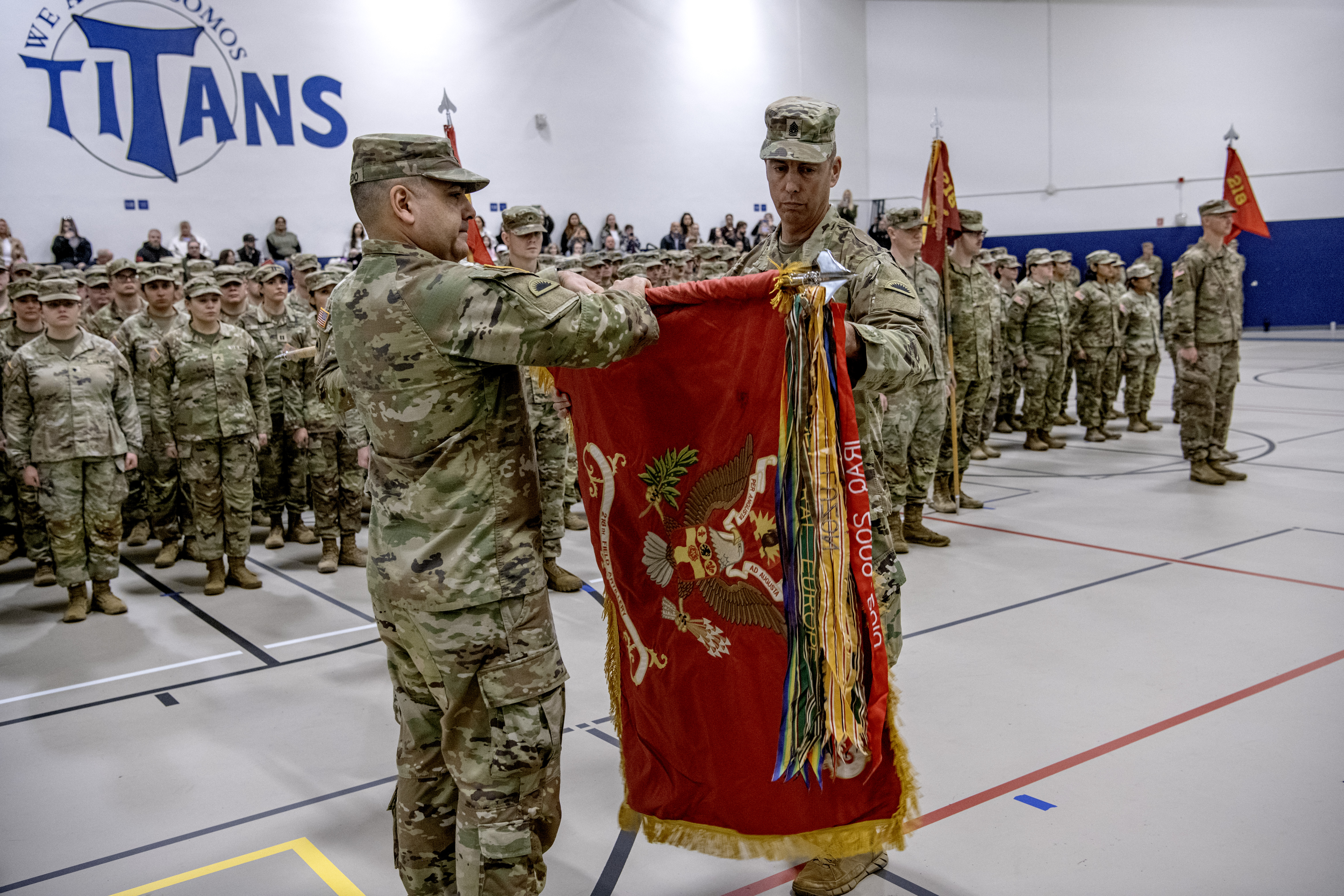 251116-Z-CH590-1220: Oregon Army National Guard Lt. Col. Manuel Robledo, commander of the 2nd Battalion, 218th Field Artillery Regiment (left), with assistance, uncases the unit colors during the demobilization ceremony held for the unit on Nov. 16, 2025, at Neil Armstrong Middle School in Forest Grove. Approximately 230 members of the unit deployed to support Operation Inherent Resolve at eight separate geographically dispersed sites in Jordan, Iraq, and Syria during their year-long mobilization. (Oregon National Guard photo by John Hughel)