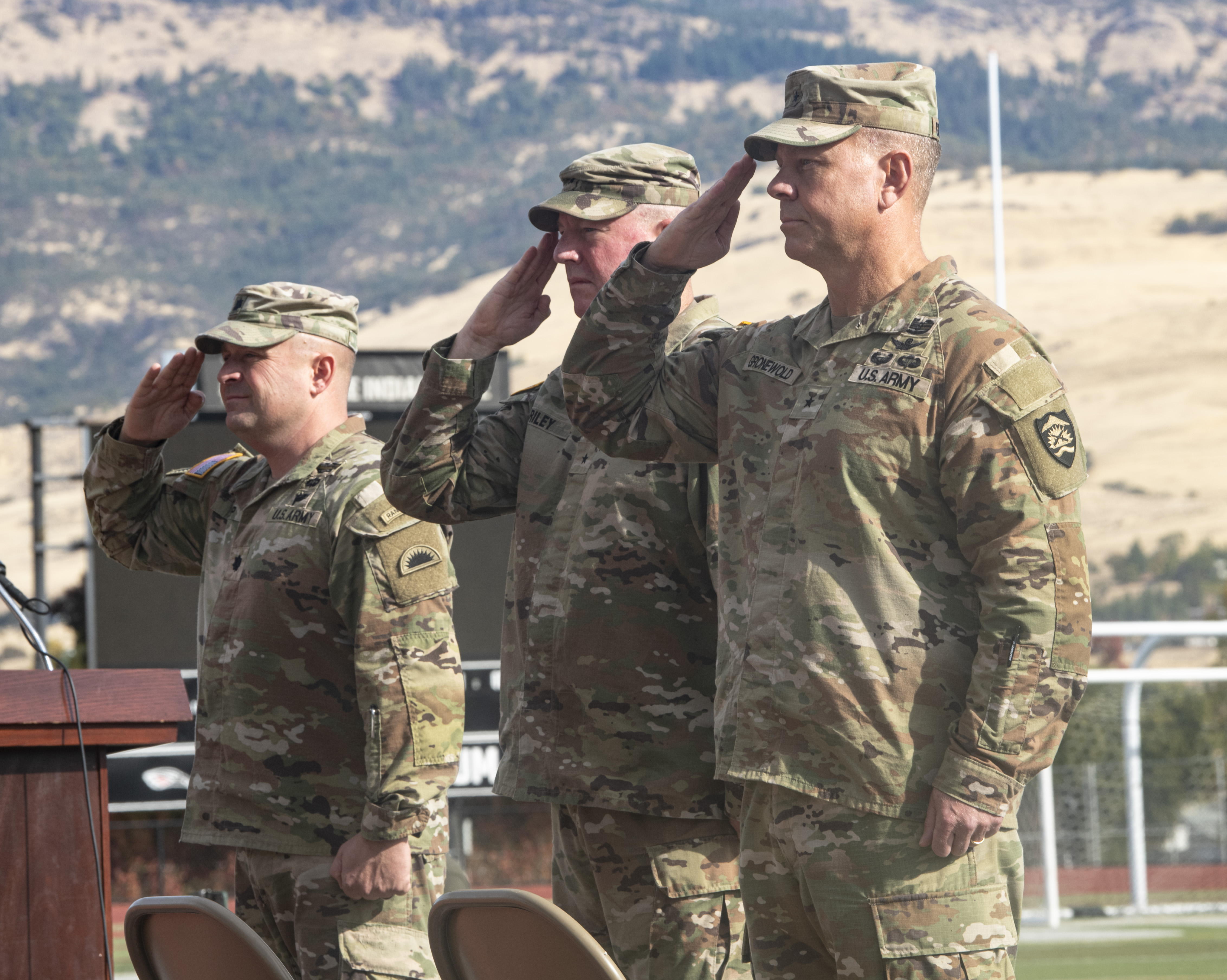 241020-Z-CH590-1133: Oregon Army National Guard senior leaders and members of the Official Party (left to right) Lt. Col. Joshua Rapp, 1st Battalion, 186th Infantry Regiment, Battalion Commander, Brig. Gen. Eric J. Riley, Oregon Army National Guard Land Component Commander, and Brig. Gen. Alan R. Gronewold, Adjutant General, Oregon, render a hand salute during the playing of the National Anthem as part of the mobilization ceremony held for the 1st Battalion, 186th Infantry Regiment on October 20, 2024 on the campus of Southern Oregon University, in Ashland, Oregon. (National Guard photo by John Hughel, Oregon Military Department Public Affairs)