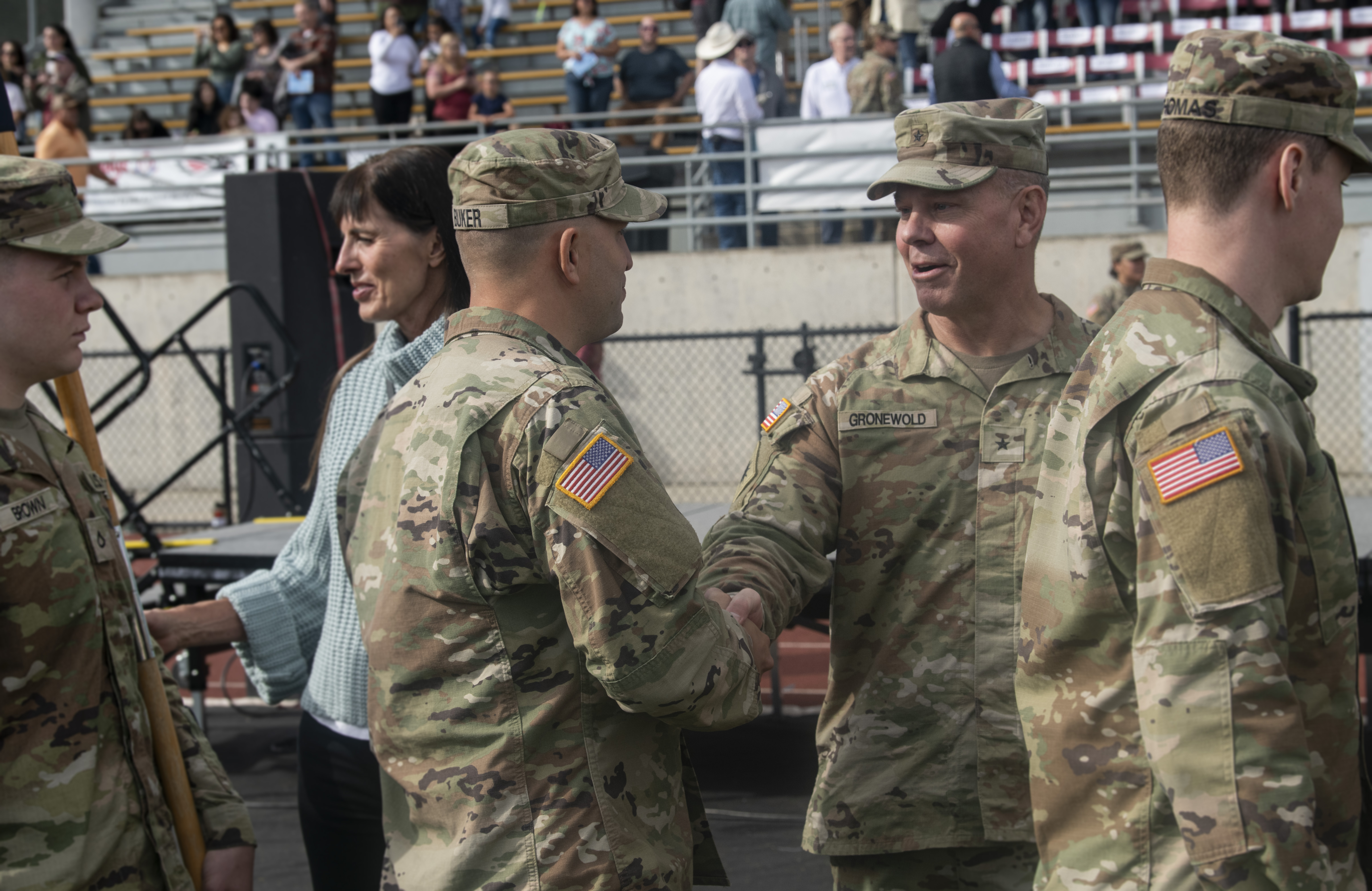 241020-Z-CH590-1188: Brig. Gen. Alan R. Gronewold, Adjutant General, Oregon, greets Soldiers assigned to the 1st Battalion, 186th Infantry Regiment in a receiving line following their formal mobilization ceremony held on the campus of Southern Oregon University, in Ashland, Oregon on October 20, 2024. The 1-168th Infantry Regiment is scheduled to deploy to the Sinai Peninsula of Egypt. The unit’s primary mission will be to supervise the implementation of the security provisions of the Egyptian-Israeli Treaty of Peace and employ best efforts to prevent violation of any of its terms. (National Guard photo by John Hughel, Oregon Military Department Public Affairs)