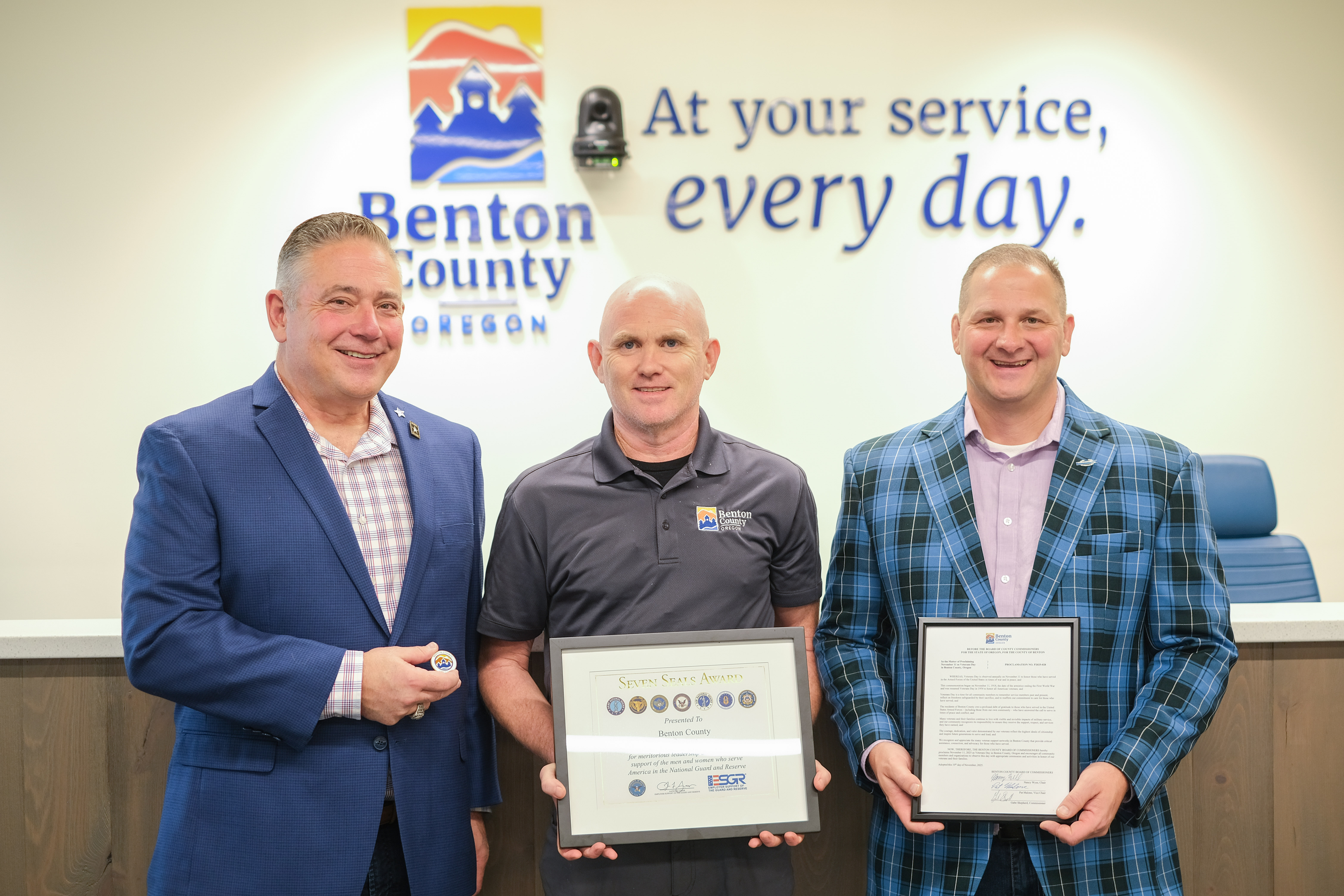 251110-A-ZJ128-5833.jpg: Oregon Employer Support of the Guard and Reserve State Chair Cecil Owens (left) pauses for a photo with Benton County commissioners and the Benton County sheriff at the Kalapuya Building in Corvallis, Ore., Nov. 10, 2025. (Oregon National Guard photo by Maj. W. Chris Clyne)
