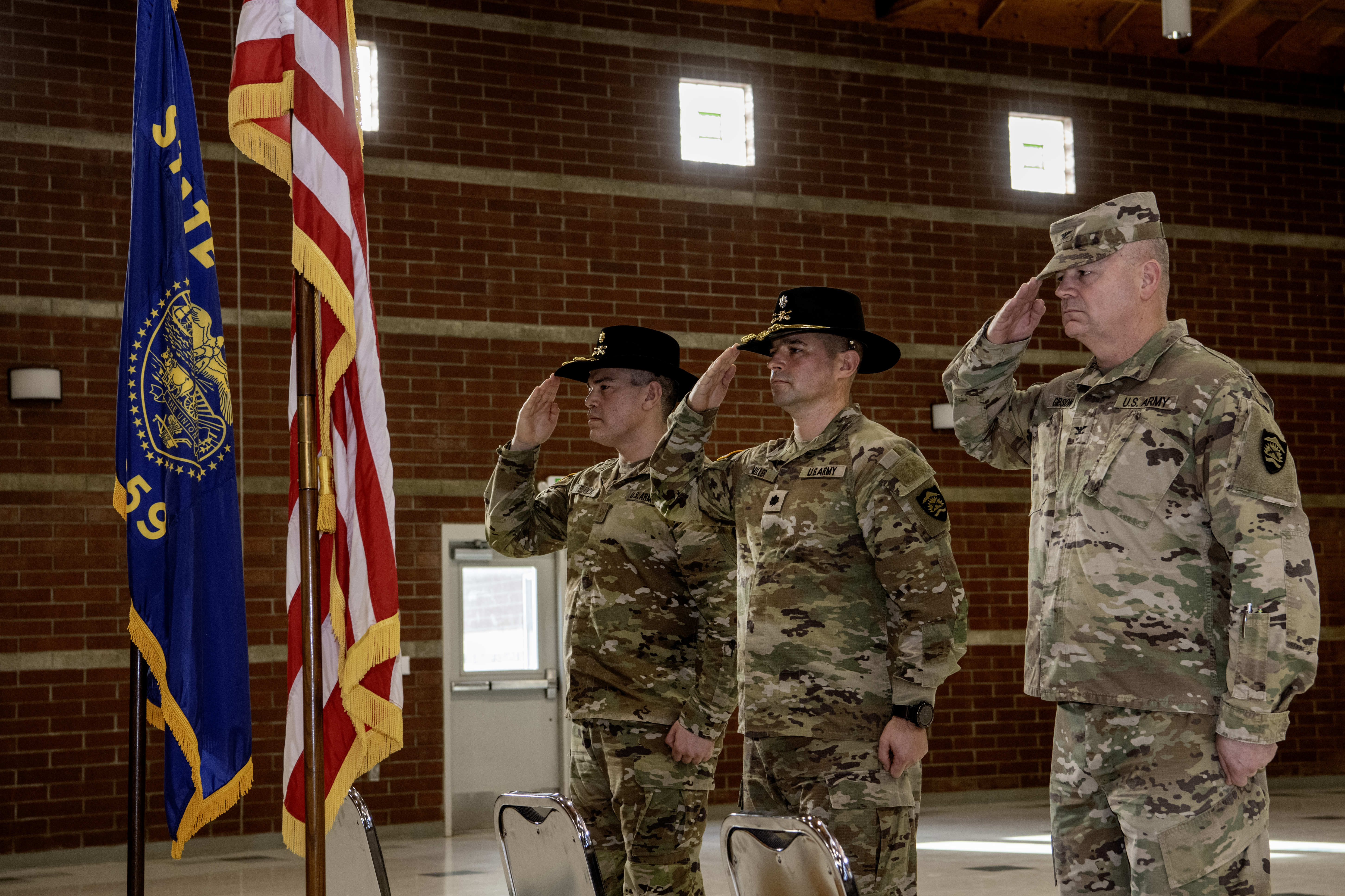 260110-Z-CH590-1120: (Left to right) Oregon Army National Guard Maj. Jorge L. De Anda, Lt. Col. Christopher R. Miller, and Col. Russell Gibson render a hand salute during the playing of the National Anthem as the Change of Command ceremony begins for the 3rd Battalion, 116th Cavalry Regiment, held at the Hermiston Army National Guard Armory in Hermiston, Oregon, on Jan. 10, 2026. Lt. Col. Miller relinquished command to Maj. De Anda, who will assume command as the unit begins a transition from armor to infantry as part of the Army’s Transformation in Contact initiative. (Oregon National Guard photo by John Hughel)