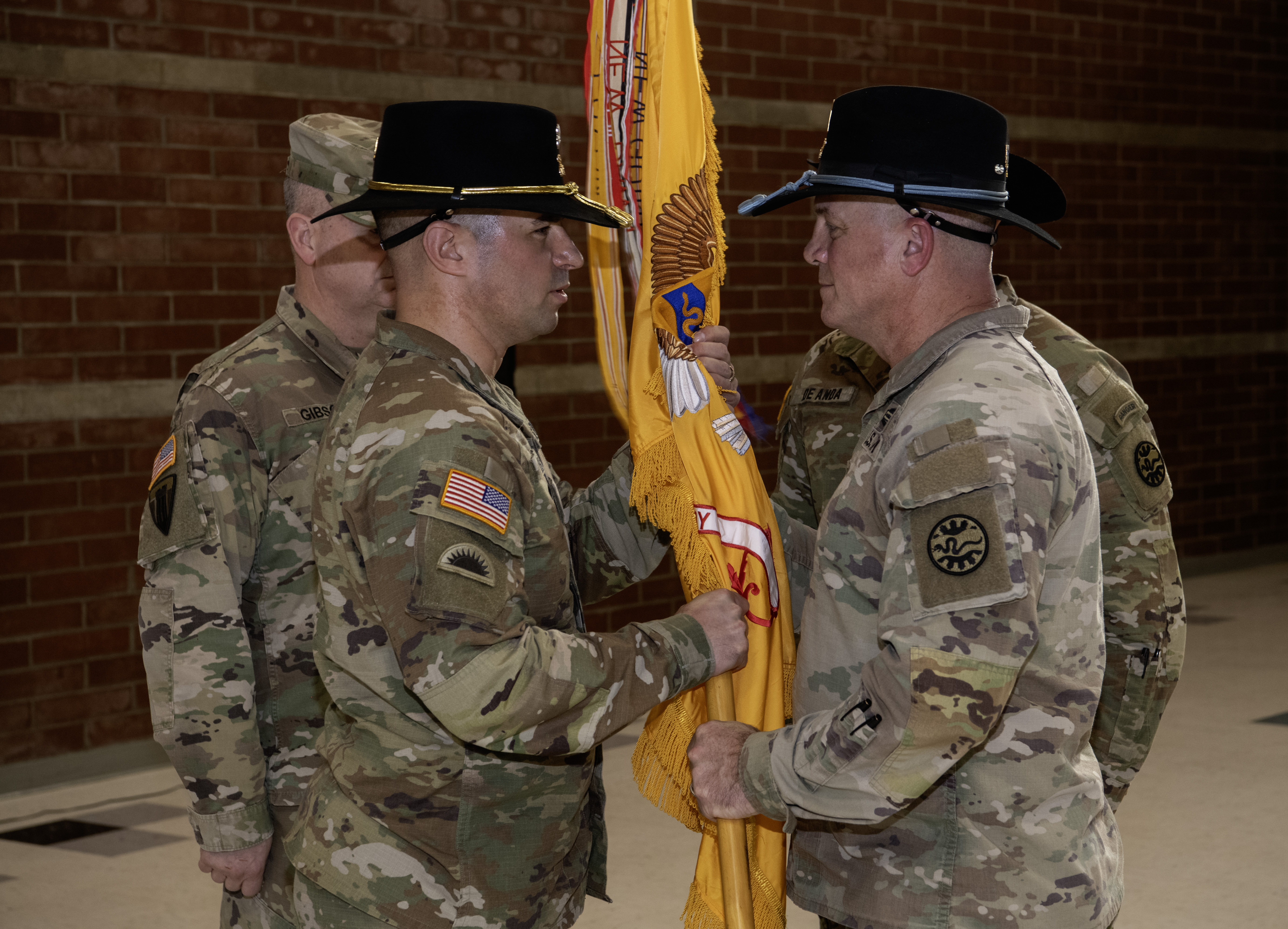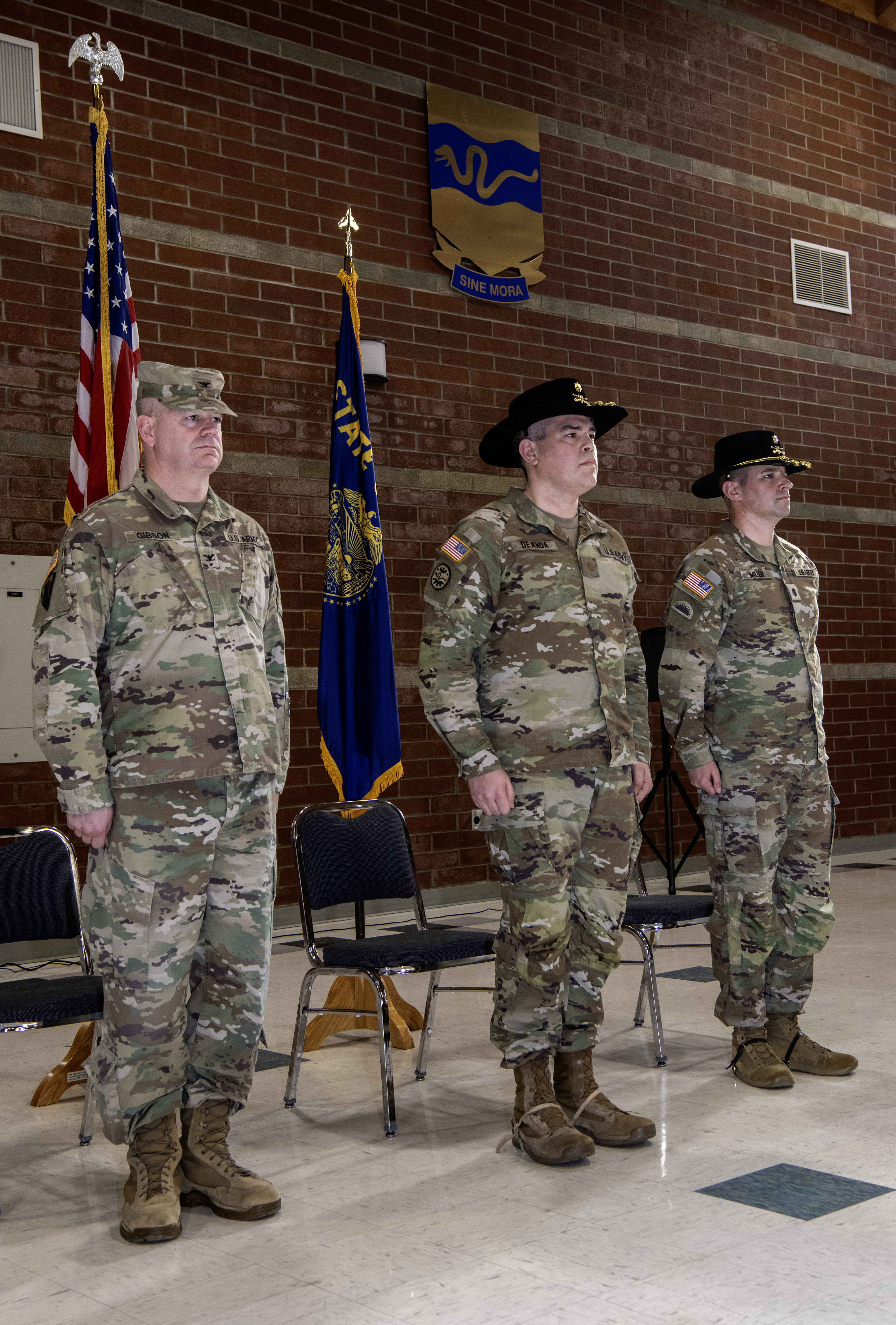 260110-Z-CH590-1128: (Left to right) Oregon Army National Guard Col. Russell Gibson, Maj. Jorge L. De Anda and Lt. Col. Christopher R. Miller stand at attention during the Change of Command ceremony for the 3rd Battalion, 116th Cavalry Regiment, held at the Hermiston Army National Guard Armory in Hermiston, Oregon, on Jan. 10, 2026. Lt. Col. Miller relinquished command to Maj. De Anda, who will assume command as the unit begins a transition from armor to infantry as part of the Army’s Transformation in Contact initiative. (Oregon National Guard photo by John Hughel)