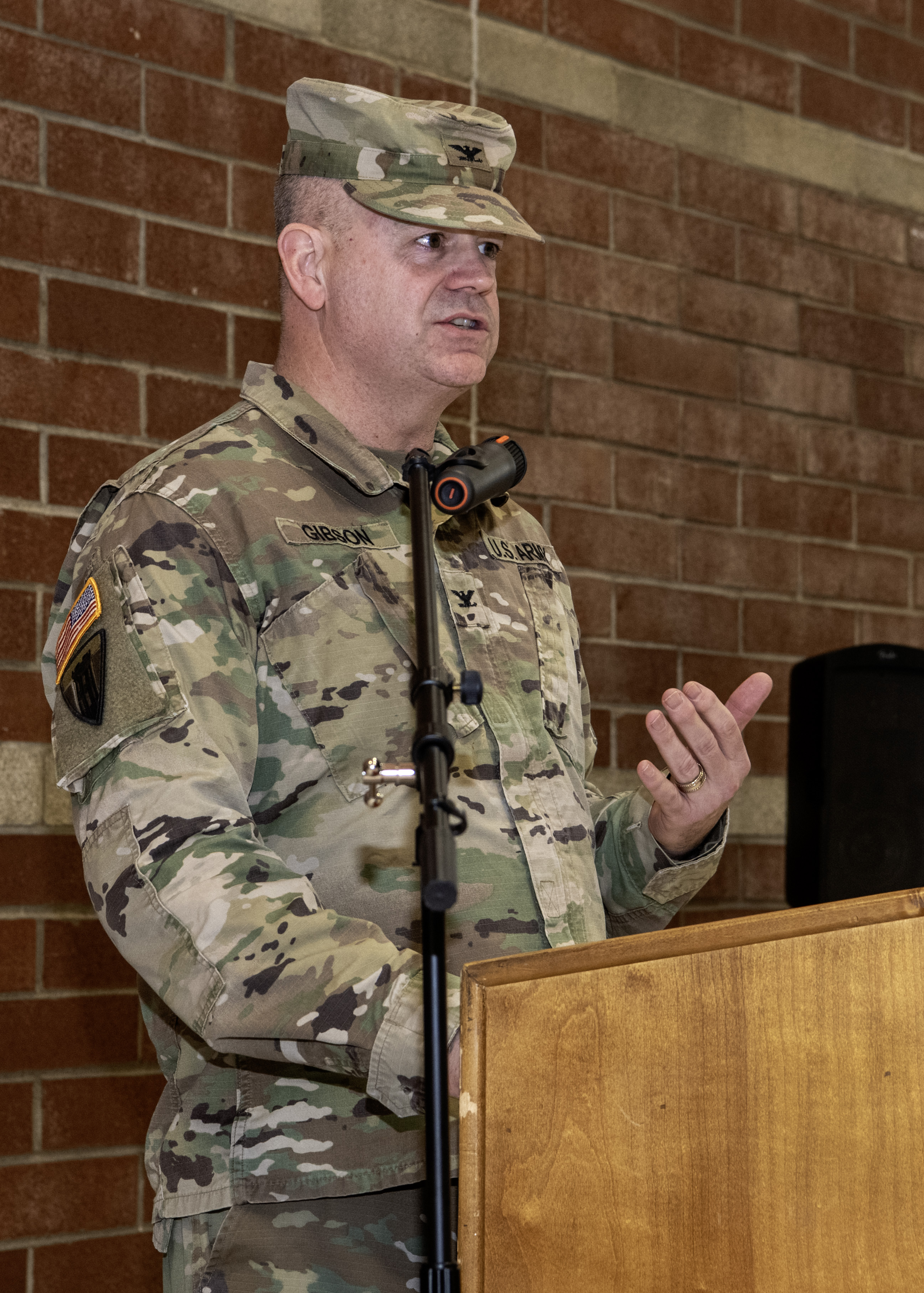 260110-Z-CH590-1133: Oregon Army National Guard Col. Russell Gibson, commander of the 82nd Troop Command Brigade, addresses those in attendance at the Change of Command ceremony for the 3rd Battalion, 116th Cavalry Regiment, held at the Hermiston Army National Guard Armory in Hermiston, Oregon, on Jan. 10, 2026. Gibson described the unit's transition from armor to infantry, drawing on the brigade's proud World War II history and lineage. (Oregon National Guard photo by John Hughel)