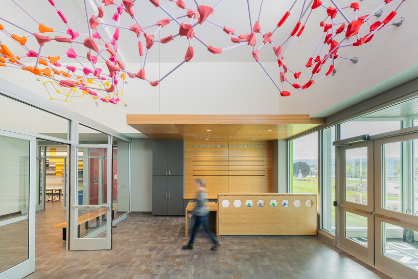 “Creating an artwork for the Oregon Manufacturing Innovation Center presented an opportunity for an exciting partnership,” she added. “OMIC generously offered access to their state-of-the-art facility in the production of 41 stainless steel 3D printed parts which can be seen where the sculpture attaches to the walls.”