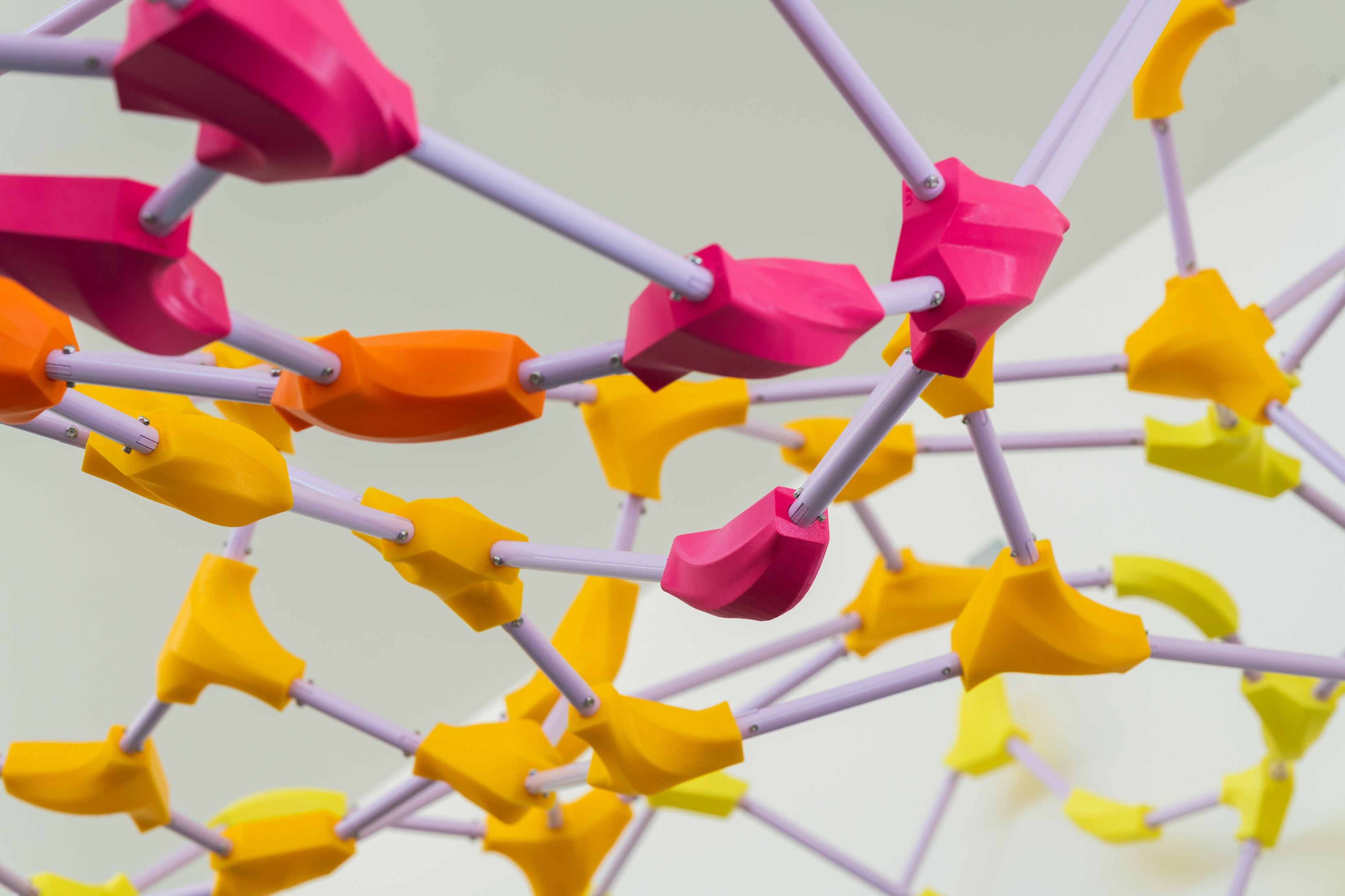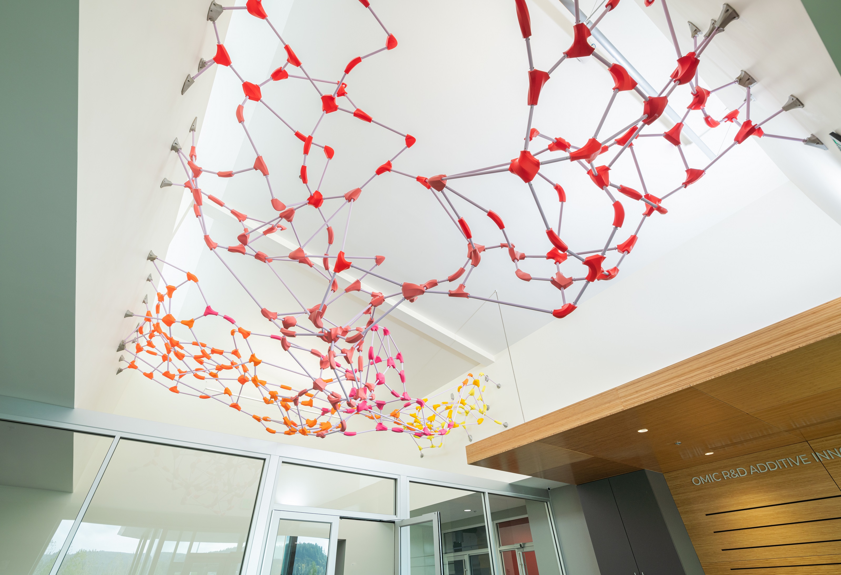 Salem, Oregon – “Rhizomatic Lilac Fizz,” a 29-foot suspended artwork by Los Angeles-based artist Lisa Little, now spans three walls of Oregon Manufacturing Innovation Center's Additive Innovation Center lobby in Scappoose. Constructed from nearly 350 unique 3D-printed plastic nodes and 550 aluminum rods, the vibrant and asymmetrical canopy-style artwork was commissioned as part of Oregon’s Percent for Art in Public Places Program, managed by the Oregon Arts Commission.
