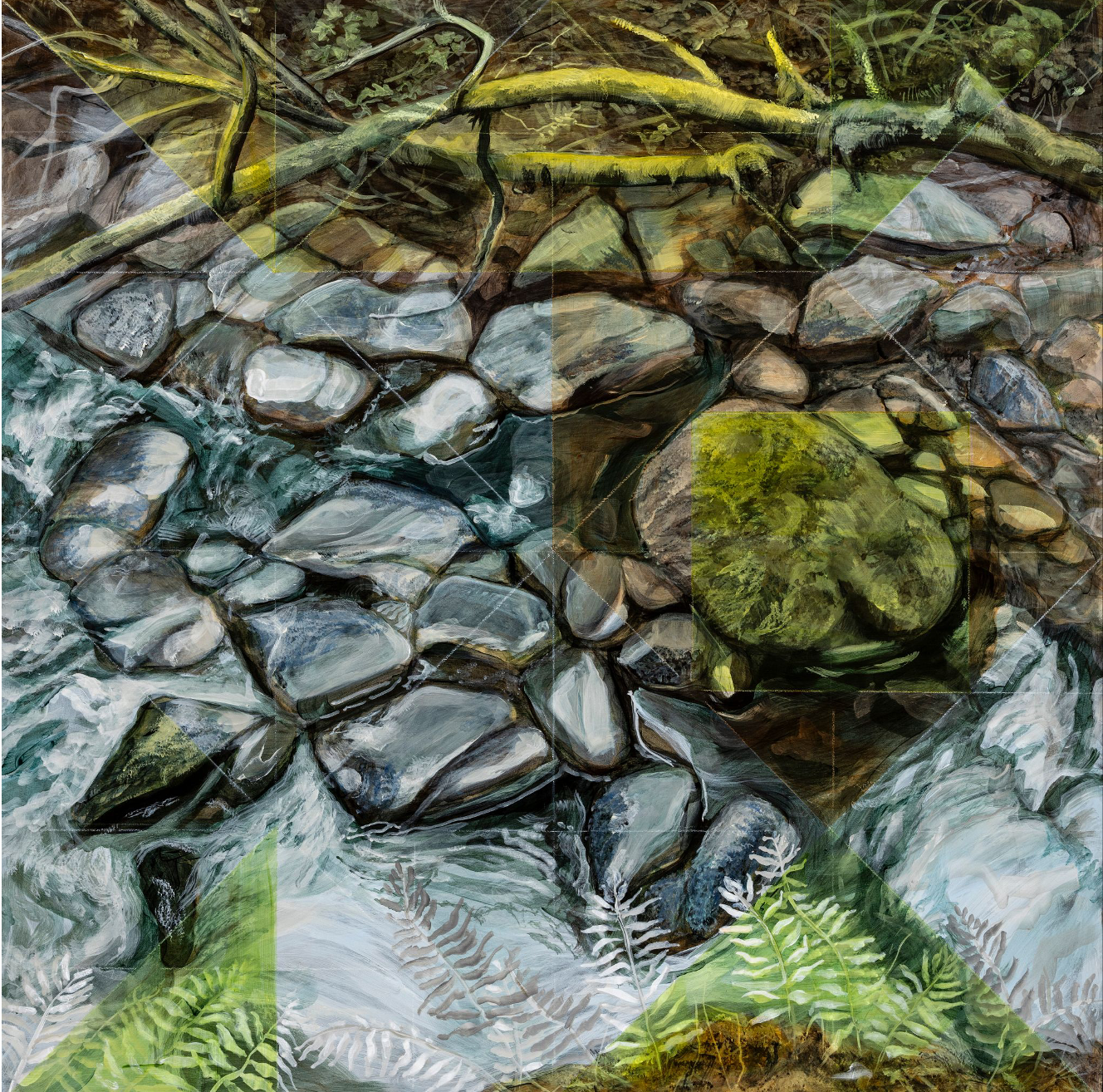 Nancy Helmsworth is a Portland, Oregon-based artist who for years, has been drawn to the rugged beauty of the Pacific Northwest. She works primarily with painting on panels and mixed media within installations. Most recently, she has directed her work to Forest Park in Portland, as a lush, representative forest which is readily accessible as a visual lab and subject source. Finding her focus shifting to kulla kulla* Creek (*means bird in chinuk-wawa, the first language of Oregon), which flows through the Bird Alliance and along Lower Macleay Trail within the park, has led her on a journey of discovery and connection with this feature. She continues to chronicle its infinite variations by the season and by running on foot. Simultaneously, she has dug deep into its “settler” history to respond to the jarring intersection of the colonial mapping/gridding of the area with the wild nature and its persistent energy. This man-made overlay is a metaphor for much of the imbalance between Western culture and the Land, one we can experience and know in our own neighborhoods when we pause to notice.