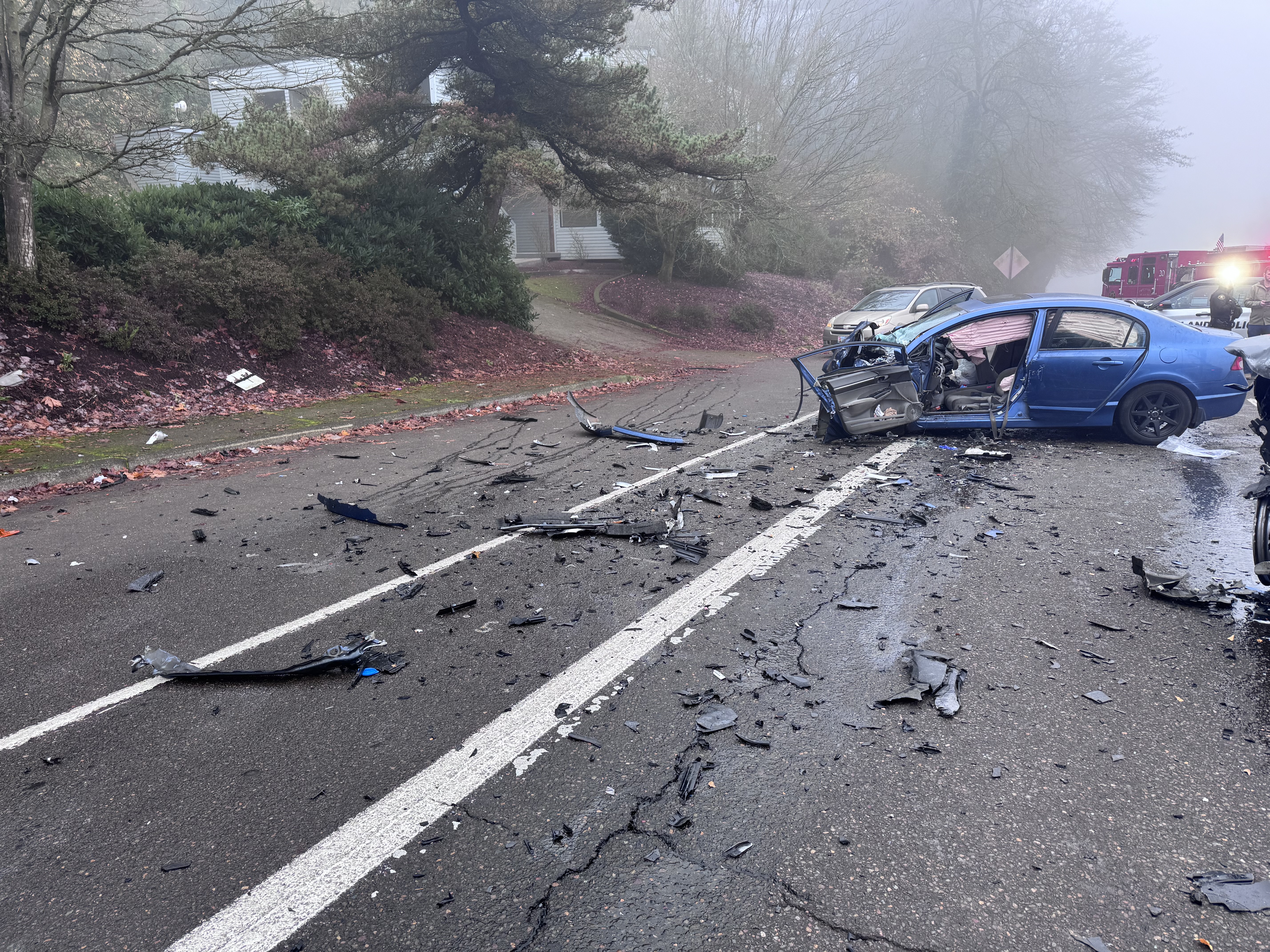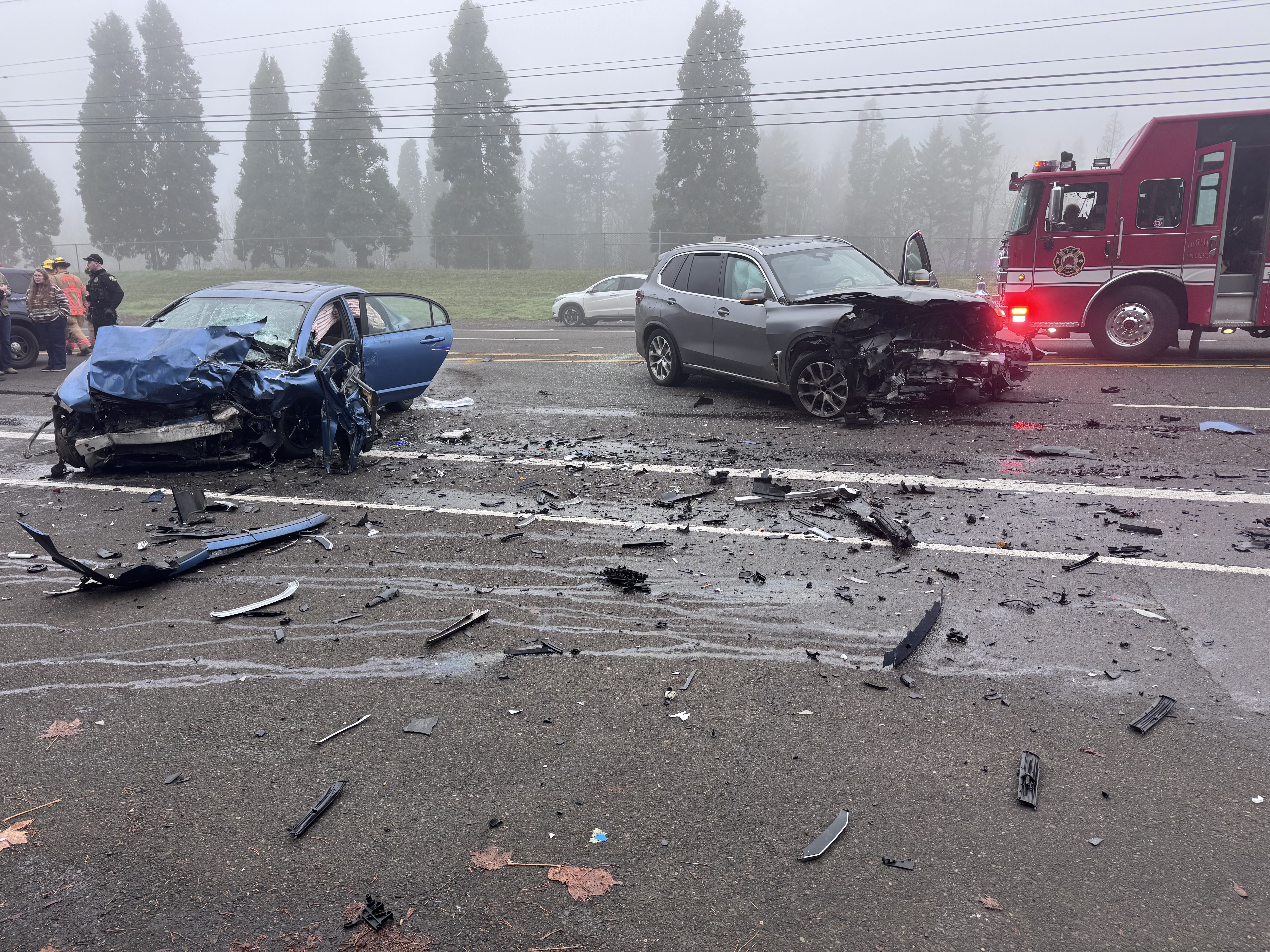 During the debrief of the incident, a head on collision occurred near SW 55th Avenue and SW Barbur Blvd. Initial reports were that were was one occupant pined in a vehicle. Several crews on scene of the fire were able to leave and quickly make it over to the accident to work and extricating the patient. That patient was transported to a hospital with injuries.