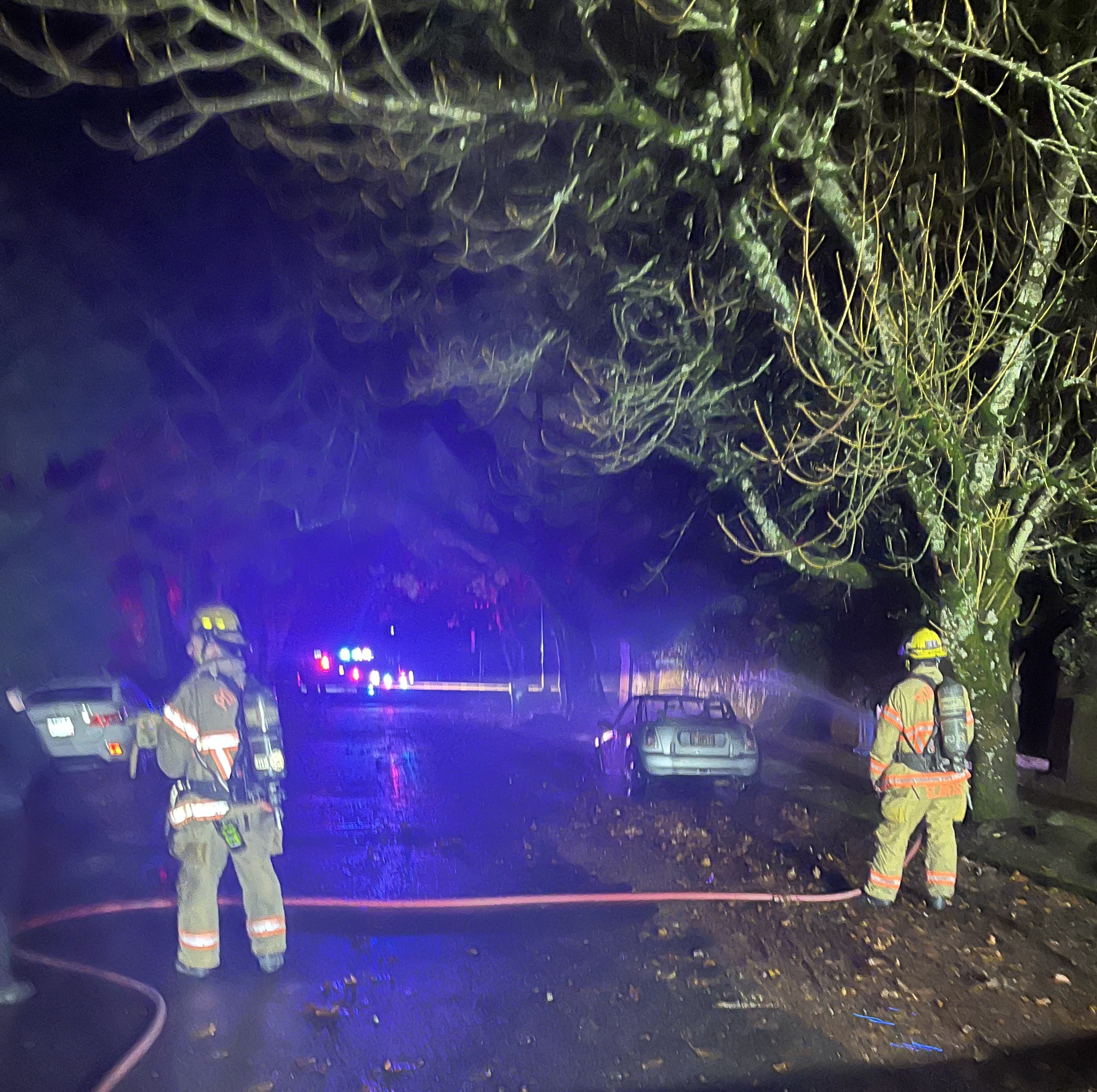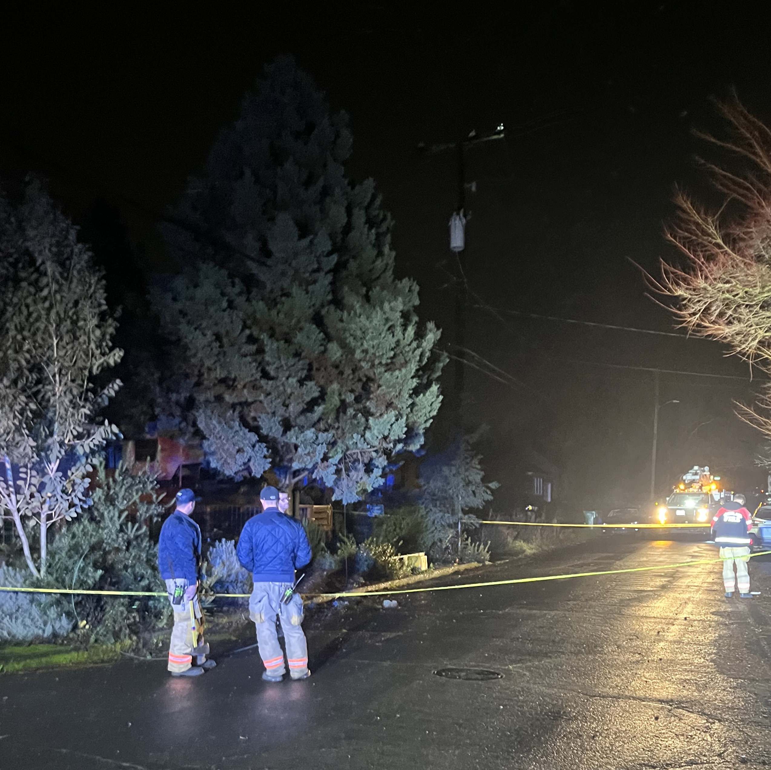 The command officer directed the crew to focus on establishing a safety perimeter with caution tape at this location and to extend a hose line as close as possible to address any possible exposure from the active vehicle fire. The command officer then contacted the Pacific Power (PPL) who serves this area and requested the power be dropped immediately in this grid as it was unknown if any other lines in the area were severed. This led to a large grid in this area be completely without power for the safety of responders and curious residents out and about investigating the scene for themselves. Downed power lines pose significant danger to anyone and unknowingly encountering an active downed powerline can have grave consequences.