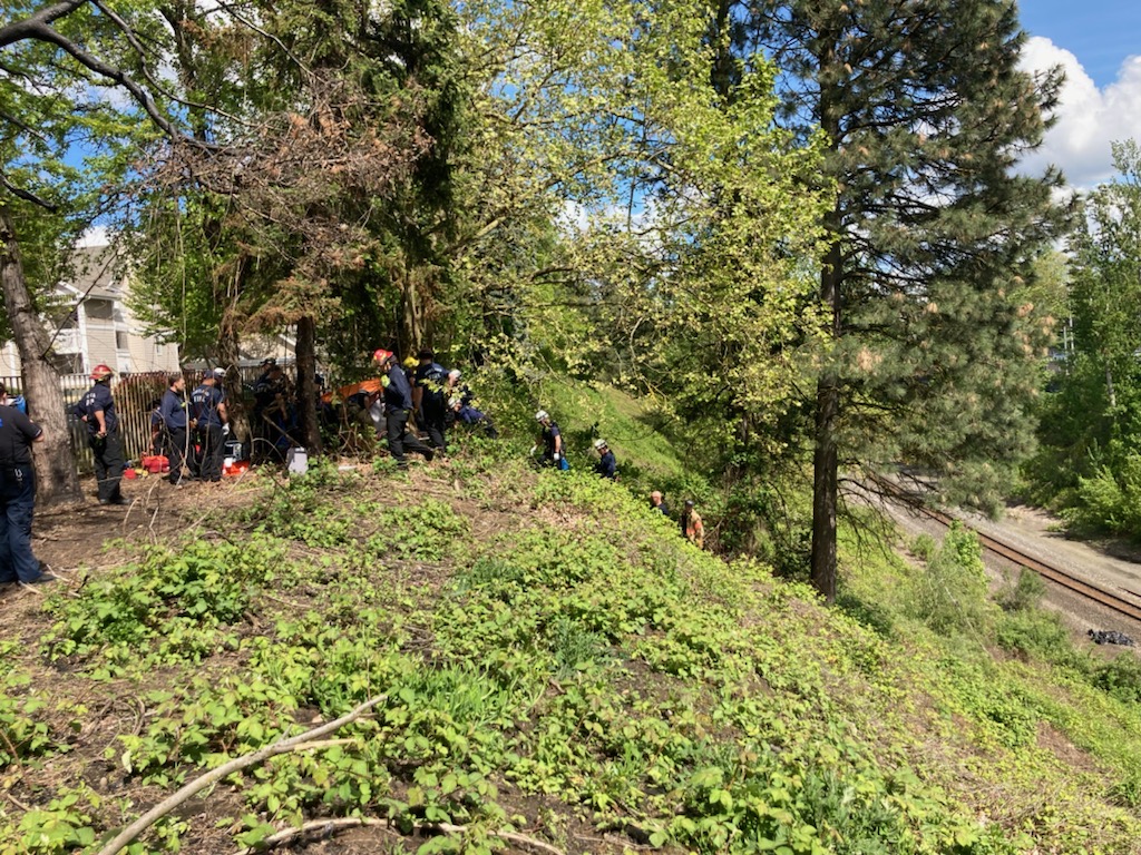 Crews were able to lower a ladder and one person was able to climb up to safety, but they needed to carry the other person up the slope on a rescue litter. The ladder climber was fine and left on their own while the other person was transported to the hospital with non-life-threatening medical issues that were unrelated to the fall. Firefighters train and practice extensively for incidents like this and that work paid off today with a positive outcome. PF&R asks the public to remember that as the weather gets nicer, trails and slopes can still be slippery so use caution and make sure you’re prepared for emergencies.