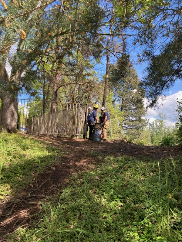 This afternoon at approximately 3pm Portland Fire crews were called to the area of NE 14th and Multnomah to assist two people who had slipped down an embankment. Firefighters determined that the individuals weren’t injured, but were unable to get back up the steep hill without assistance. Firefighters from PF&R’s technical rescue team determined that the call warranted a low angle rope rescue. A low angle rope rescue means that crews need to use ropes due to slippery and steep terrain, but most of their weight is supported by the ground. A high angle rope rescue on the other hand is a rescue where crews need to have most or all of their weight supported by a rope system (you might see this when crews practice rescuing people from Portland’s aerial tram).