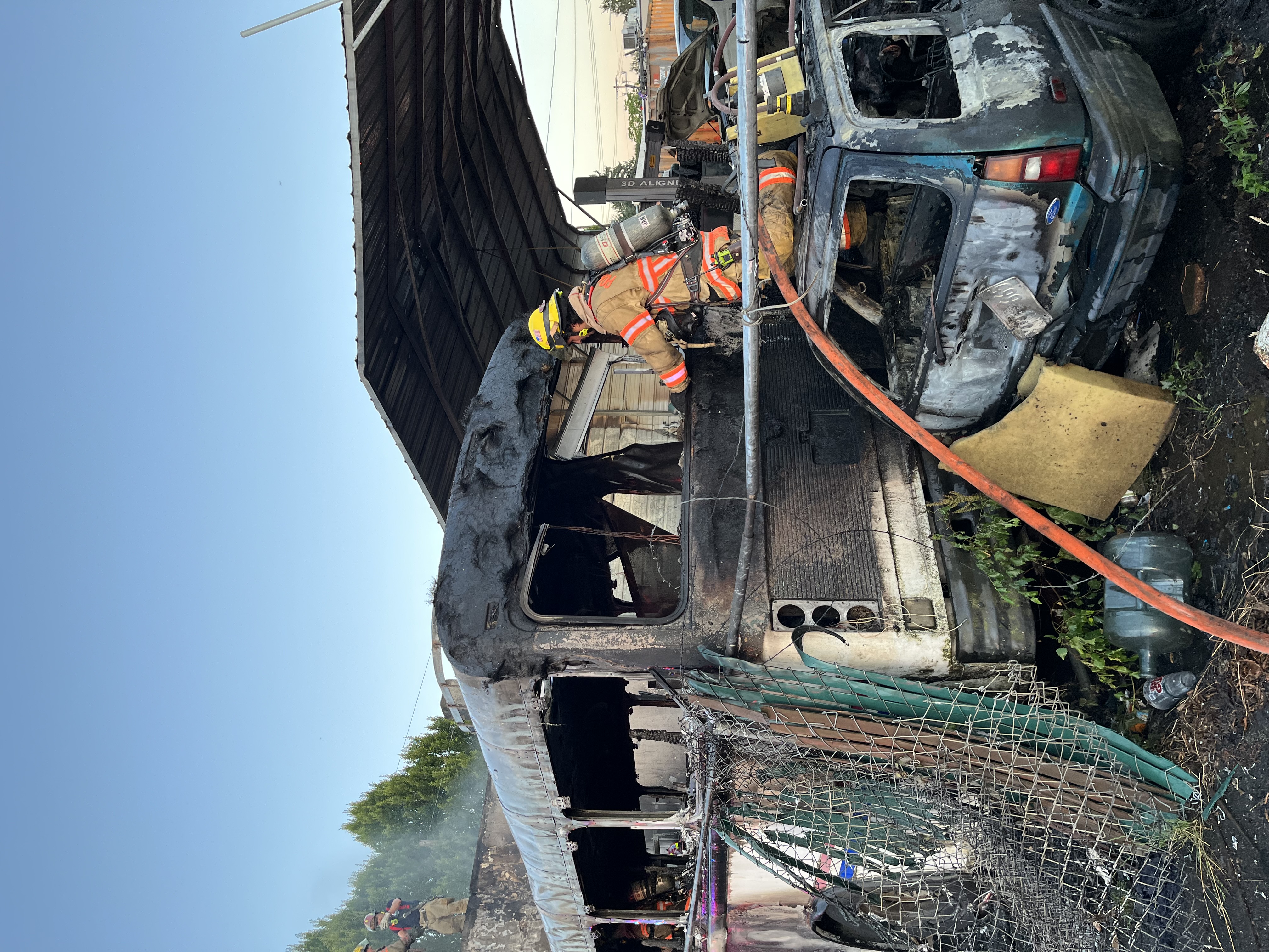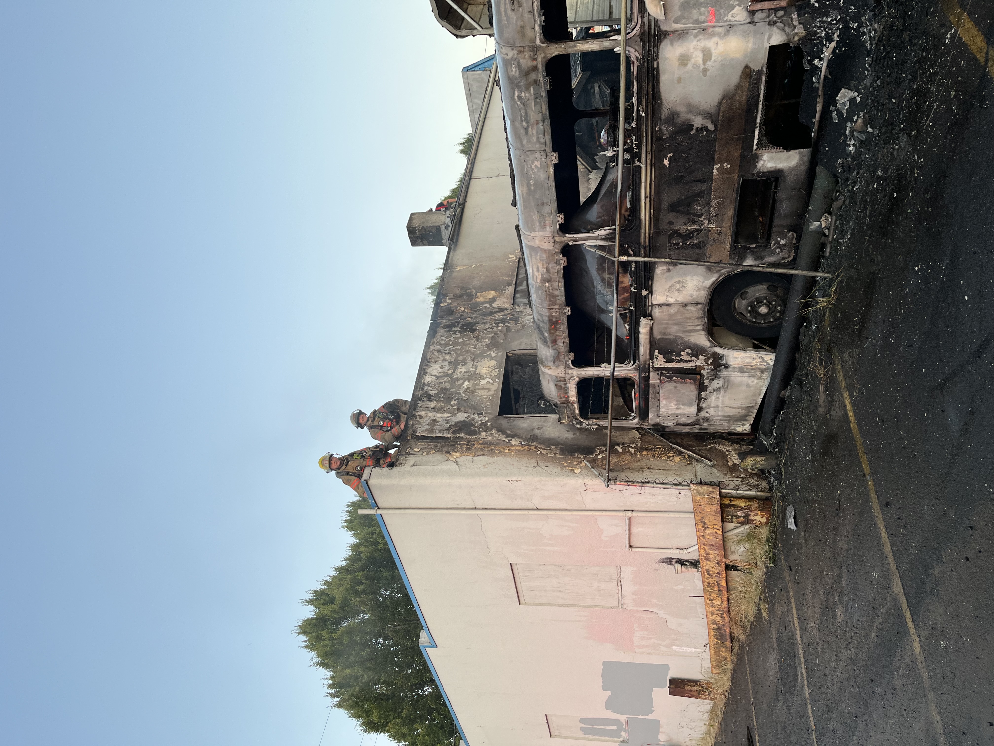 The commercial fire in the 11100 block of NE Sandy was a converted commercial bus used as a storage unit was completely engulfed in flames upon arrival of the crews. The addressed building is a 30’x30 repair shop with lots of large items and cars stored in the yard behind the shop. The nose of the bus was parked inches away from the structure, causing concerns for the crews on scene. Water was being placed on the bus from the exterior while crews gained access to the structure to investigate if any fire had extended to the inside of the addressed building. With dark smoke and little heat on the interior, crews went to the roof to find a small amount of extension of the fire to the roof decking material and a hose line was put taken aloft to extinguish the flames.