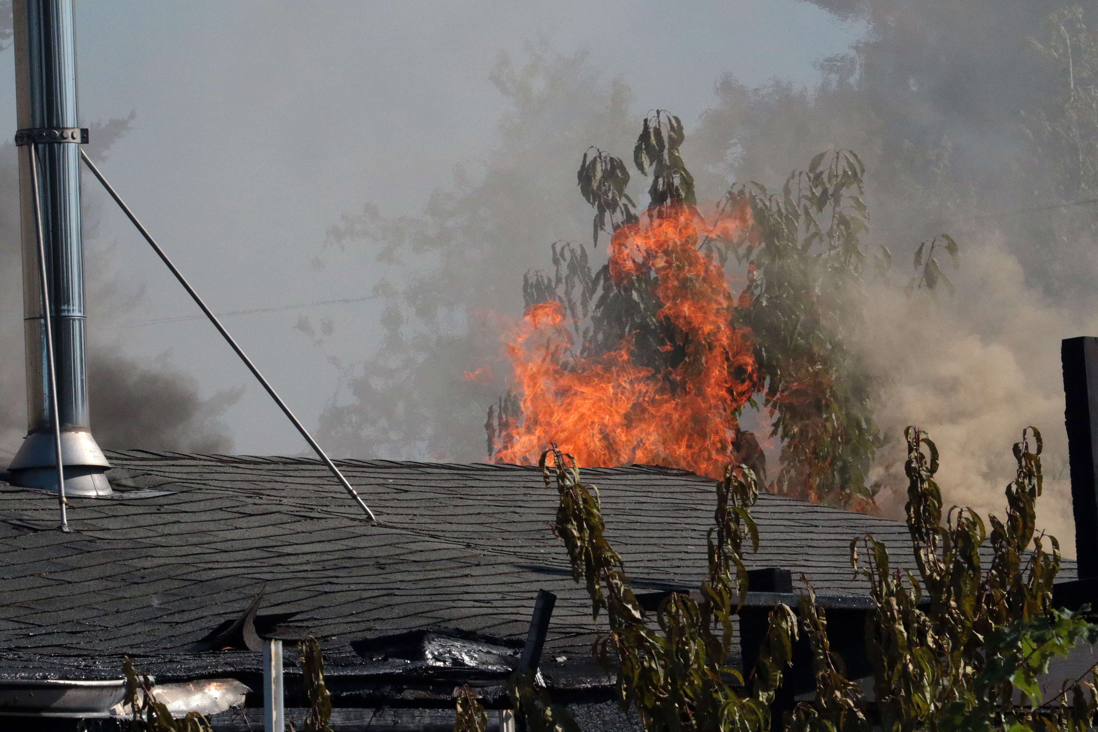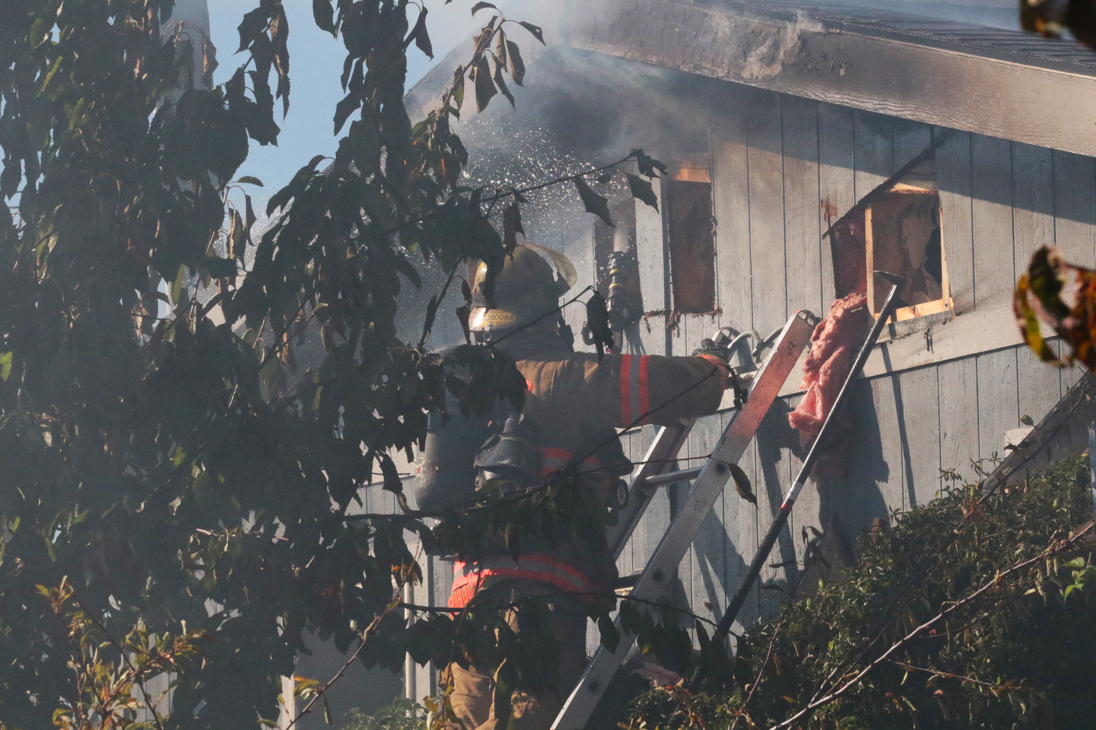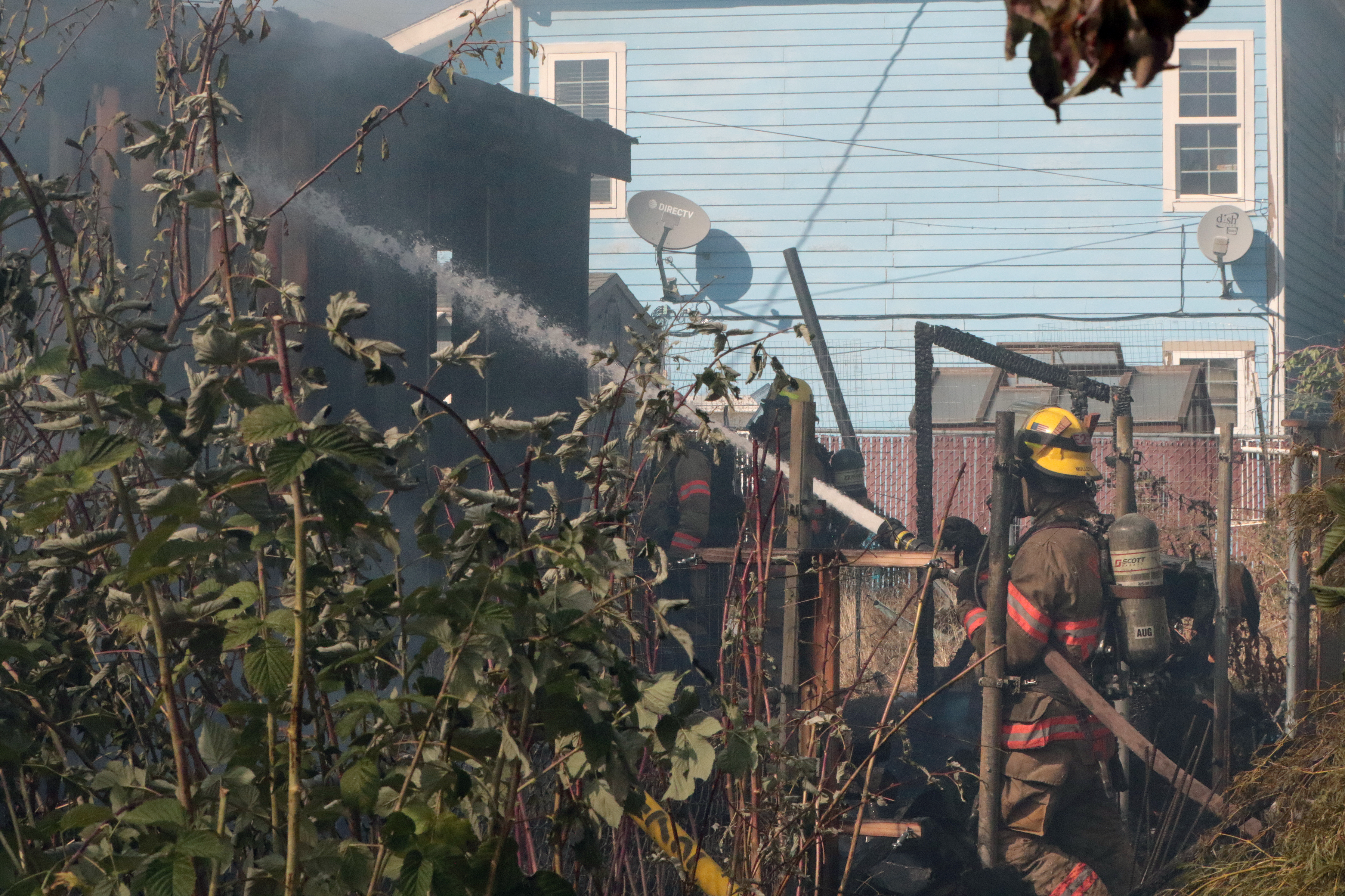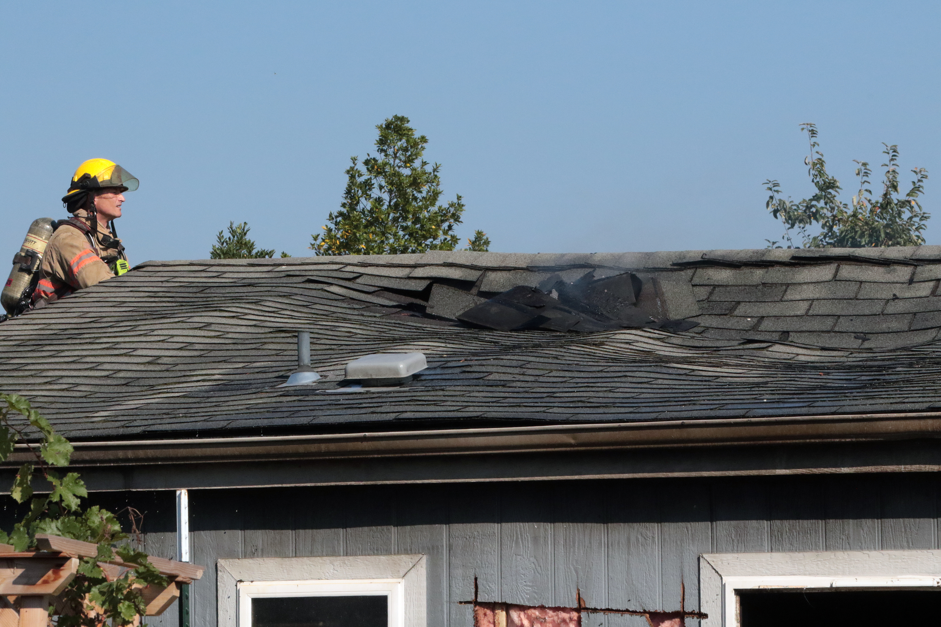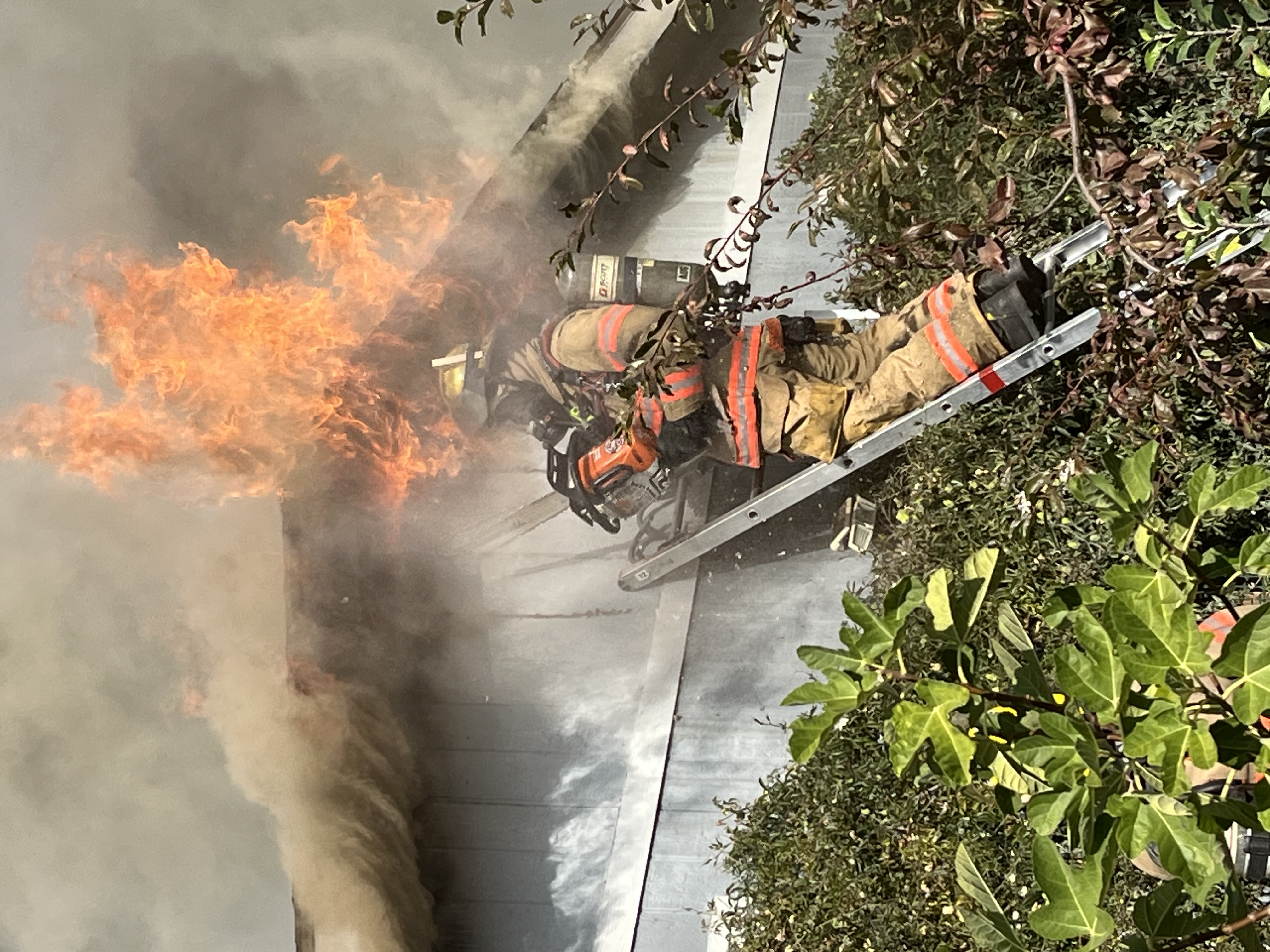 The first arriving engine, Engine 25, focused their efforts on preventing the fire from extending to the neighboring home and took an offensive fire attack tactic, taking hose lines to the interior of the structure along with reducing the flames in the vegetation and objects between the homes. Engine 20, arriving second, took a large hose off their engine and performed the initial defensive fire attack on the primary fire home reducing the flames to prevent any further extension of the fire. The crew of Engine 25 eliminated the flames impinging on the second home quickly and were able to focus their attention on the primary fire structure.