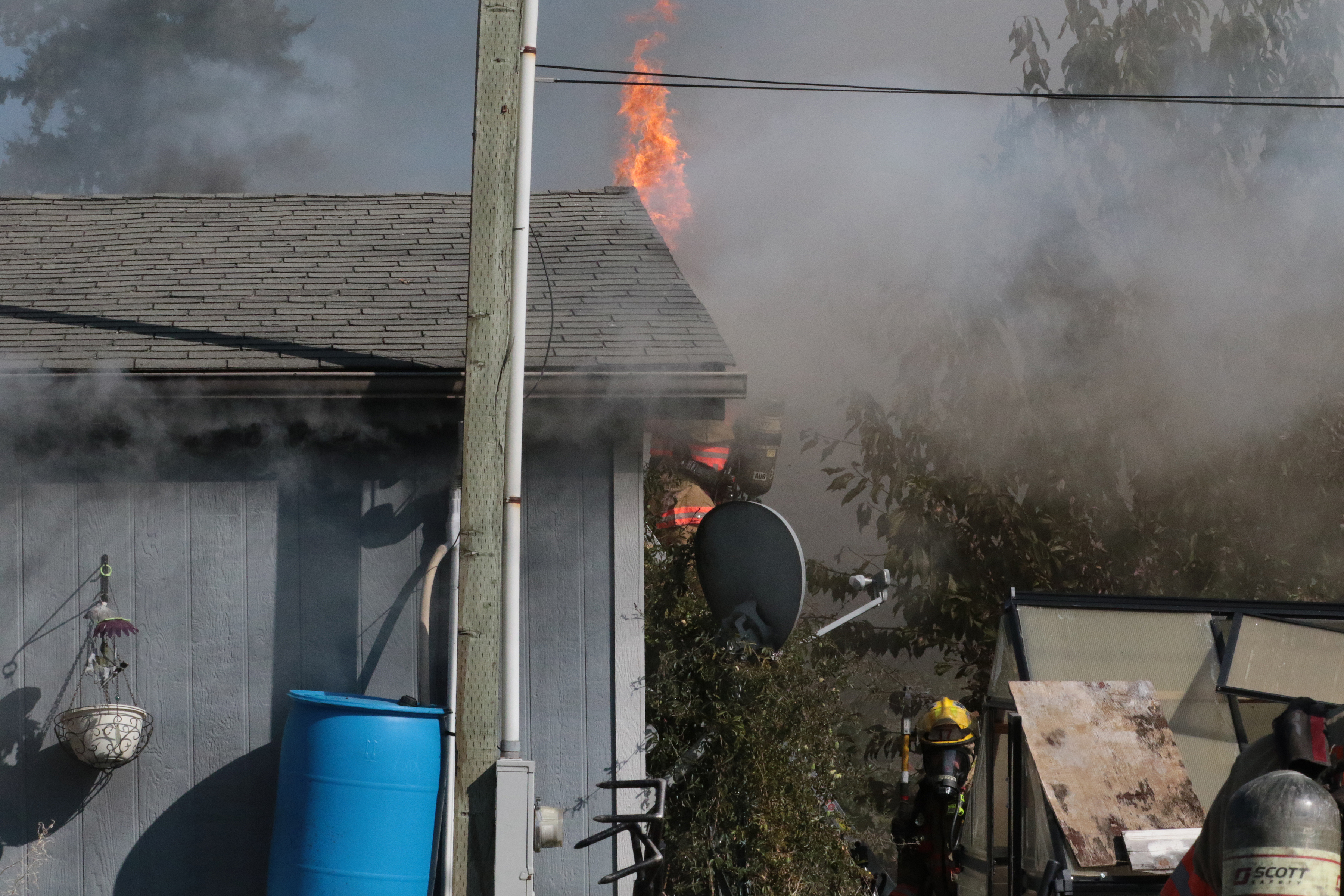 At 2:40 PM, BOEC dispatched out reports of a residential fire in the Brentwood – Darlington Neighborhood of SE Portland. Initial reports were a home at the corner of SE 54 and Lambert was on fire with the fire extending into the yard and flames impinging on the neighboring home. The first arriving member of PF&R was an on-duty fire investigator in the area and confirmed there were two homes affected with one completely involved with fire and the flames beginning to extend into the neighboring home. The fire was immediately elevated to a 2nd alarm fire with 2 homes involved, placing over 50 members of PF&R and CCFD on scene or enroute to the incident.