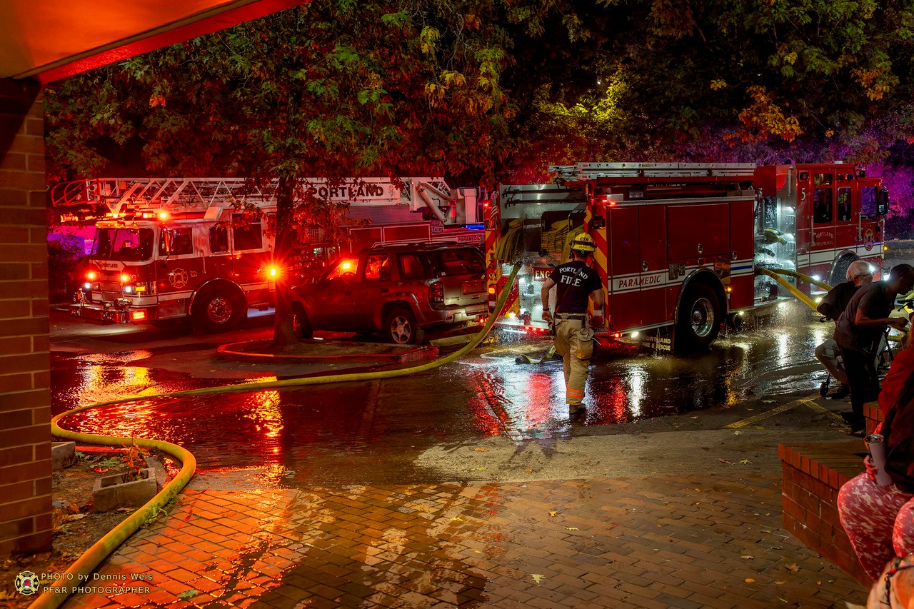 At just past midnight this morning, Portland Fire & Rescue crews were dispatched to an apartment fire in a four-story apartment building in the Bridlemile neighborhood on Beaverton Hillsdale Highway. Upon their arrival, crews began search and rescue as well as fire suppression operations. A second alarm was called by Incident Command at 12:15 am to have additional resources available to assist with any potential rescue and evacuation needs and to have enough firefighters on scene in case this fire extended into the structure.