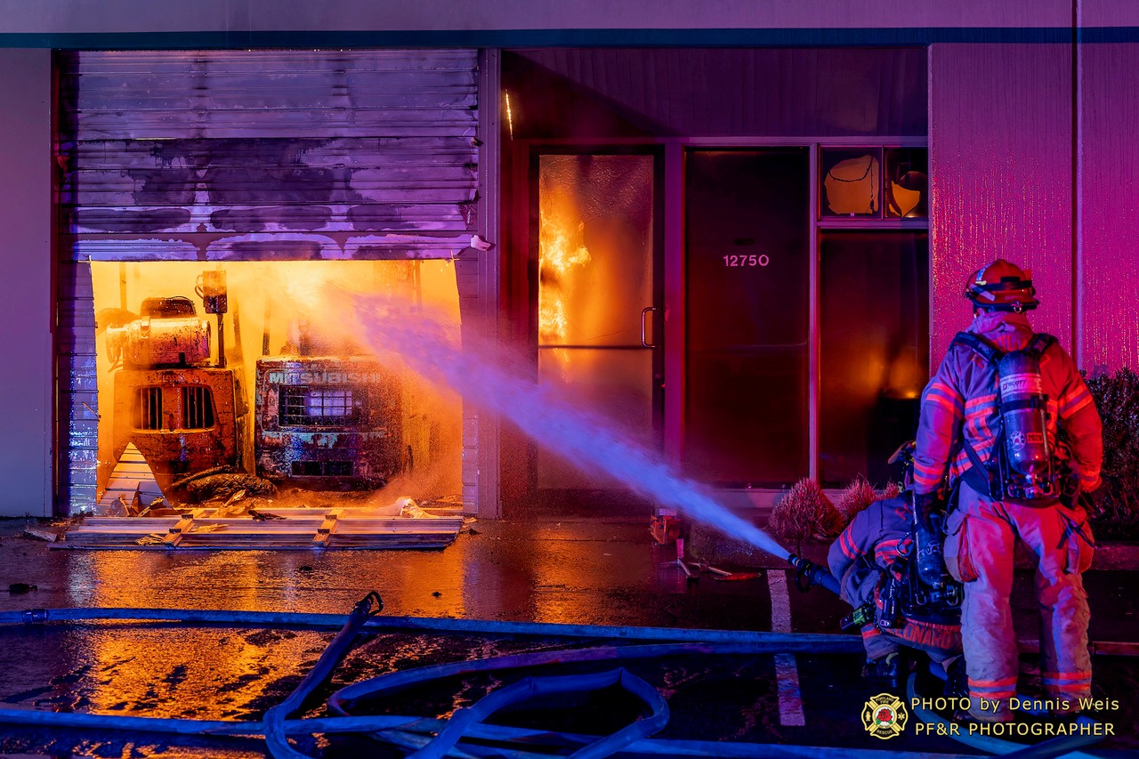 It was quickly determined that this concrete tilt-up style warehouse contained several businesses, but they all were closed and no employees were on-site, so a defensive fire attack was initiated. Elevated master streams were set up to attack the fire from above as sections of the roof had burned through. Additionally, large hose lines were deployed to attack the fire through openings along the sides of the building, including several bay doors that had been forced open by firefighters.