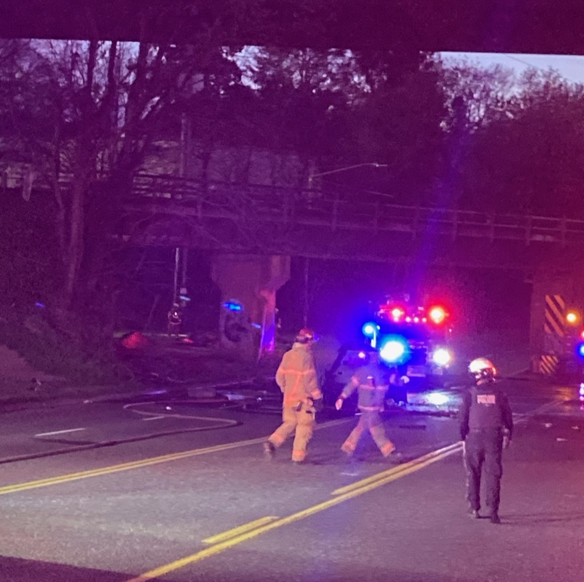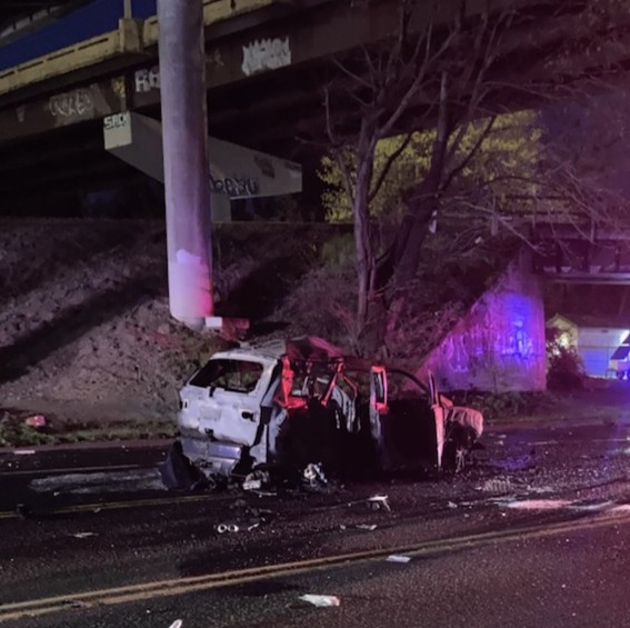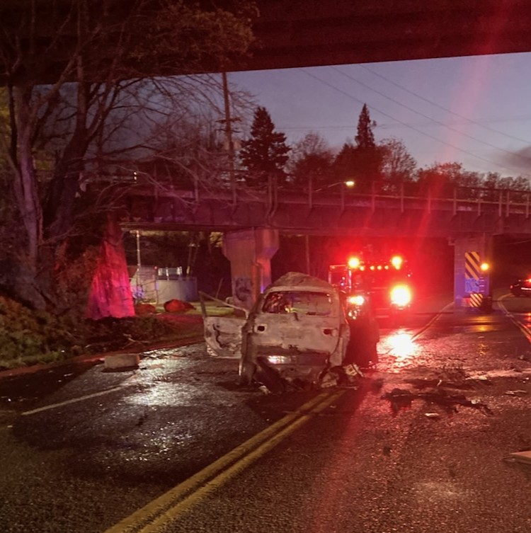 Portland Fire & Rescue responded to reports of a van completely involved in fire with a reported 6 trapped occupants yesterday evening just before 8 PM. BOEC dispatchers received multiple calls from passerby vehicles that a van under I5 on Columbia Blvd near Delta Park indicating a van was completely engulfed in flames. The heavy smoke column rising into the sky made it evident to the arriving crews that there was a very significant fire and if accurate and occupants were trapped, lives were in jeopardy.