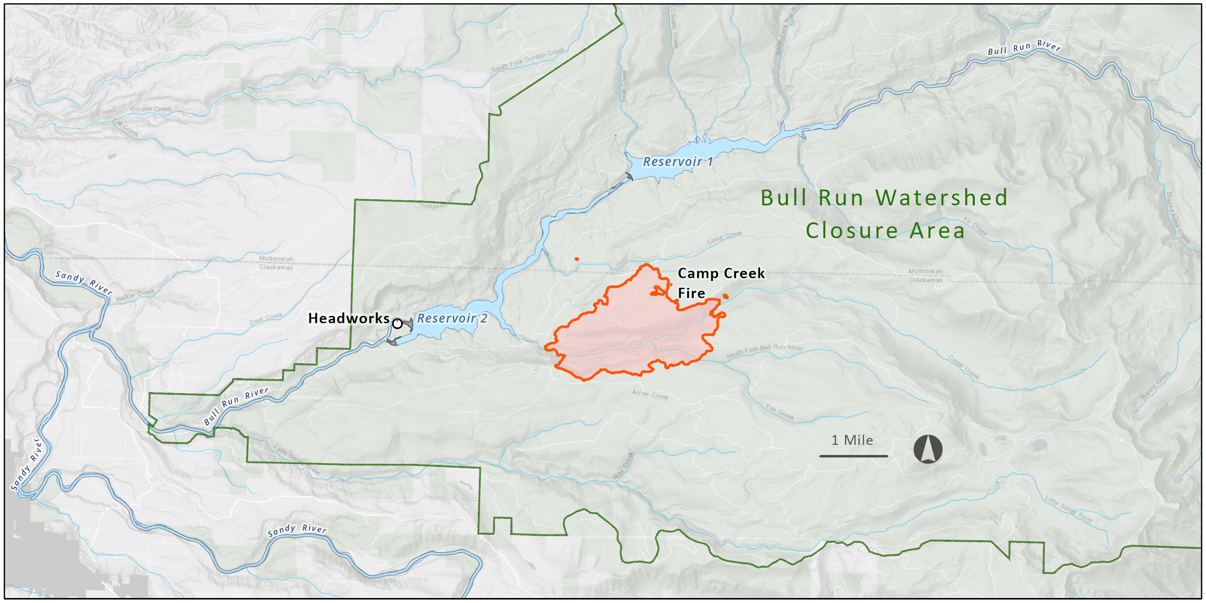The Portland Water Bureau continues to monitor the spread of the Camp Creek Fire burning in the Bull Run Watershed, which is estimated to be 1,607 acres and zero percent contained as of the evening of August 27. The fire is approximately 1.3 miles from Reservoir 1 and approximately 2.1 miles from the Water Bureau’s Headworks treatment facility.