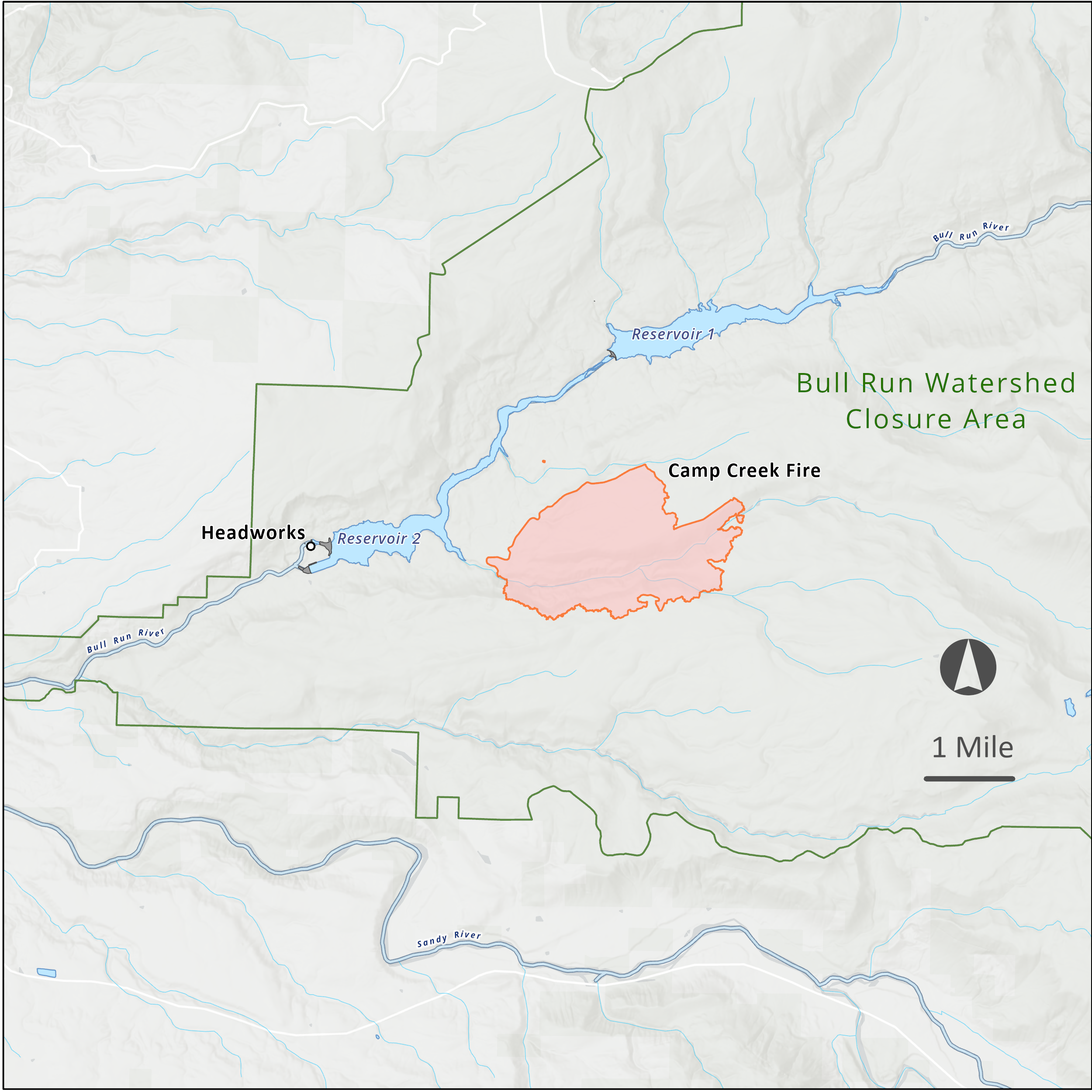The Portland Water Bureau continues to monitor the Camp Creek Fire burning in the Bull Run Watershed, the city’s main water supply. The fire is estimated to be 2,023 acres as of the morning of September 12, and estimated containment has increased to 44 percent. The fire remains approximately 1.3 miles from Reservoir 1 and approximately 1.9 miles from the Water Bureau’s Headworks treatment facility.