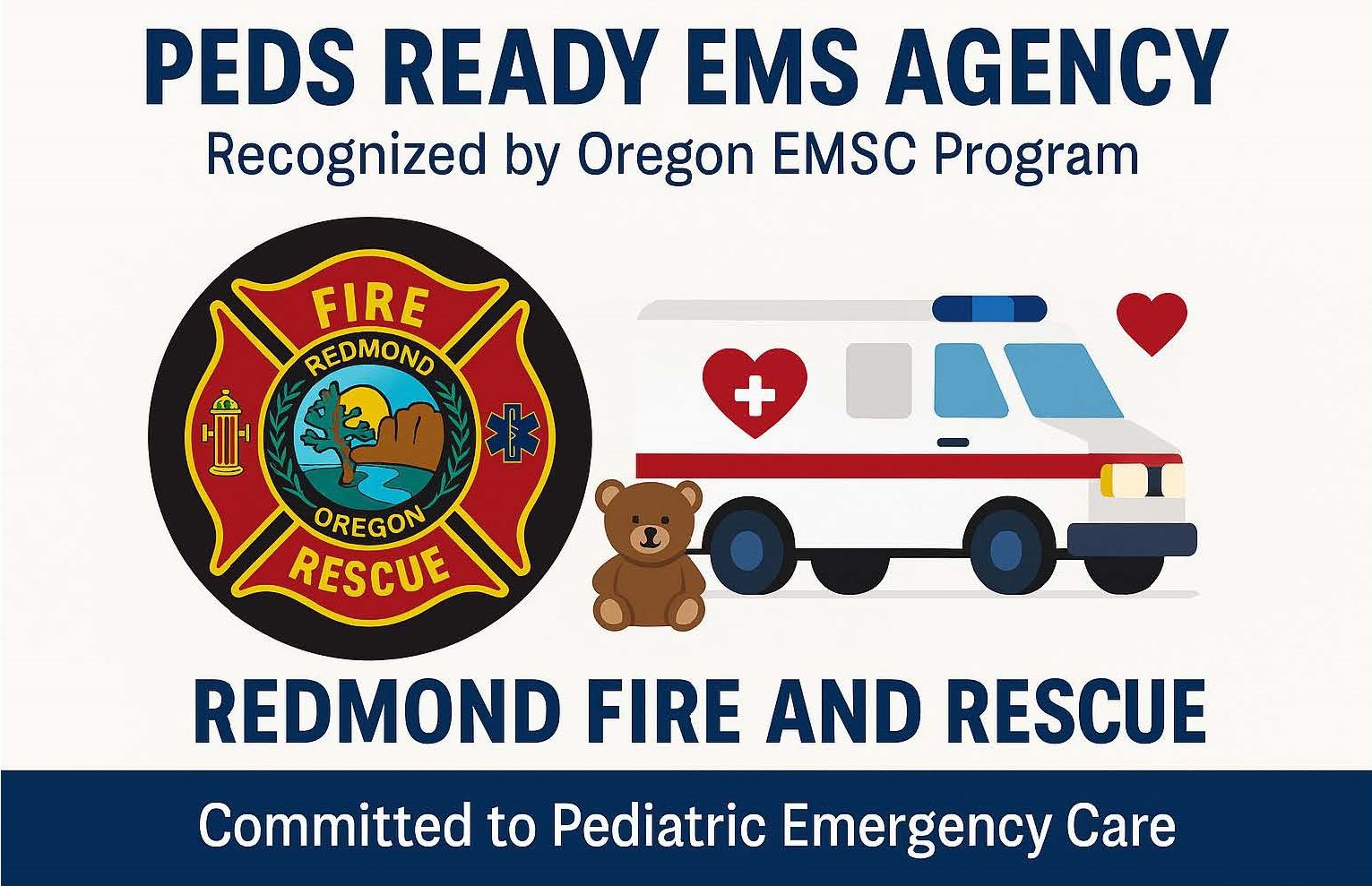September 10, 2025-Redmond, Oregon — Redmond Fire and Rescue is proud to announce its official recognition as a Peds Ready EMS agency by the Oregon Emergency Medical Services for Children (EMSC) Program. This designation reflects the department’s commitment to providing high-quality emergency medical and trauma care to pediatric patients in the Redmond community.