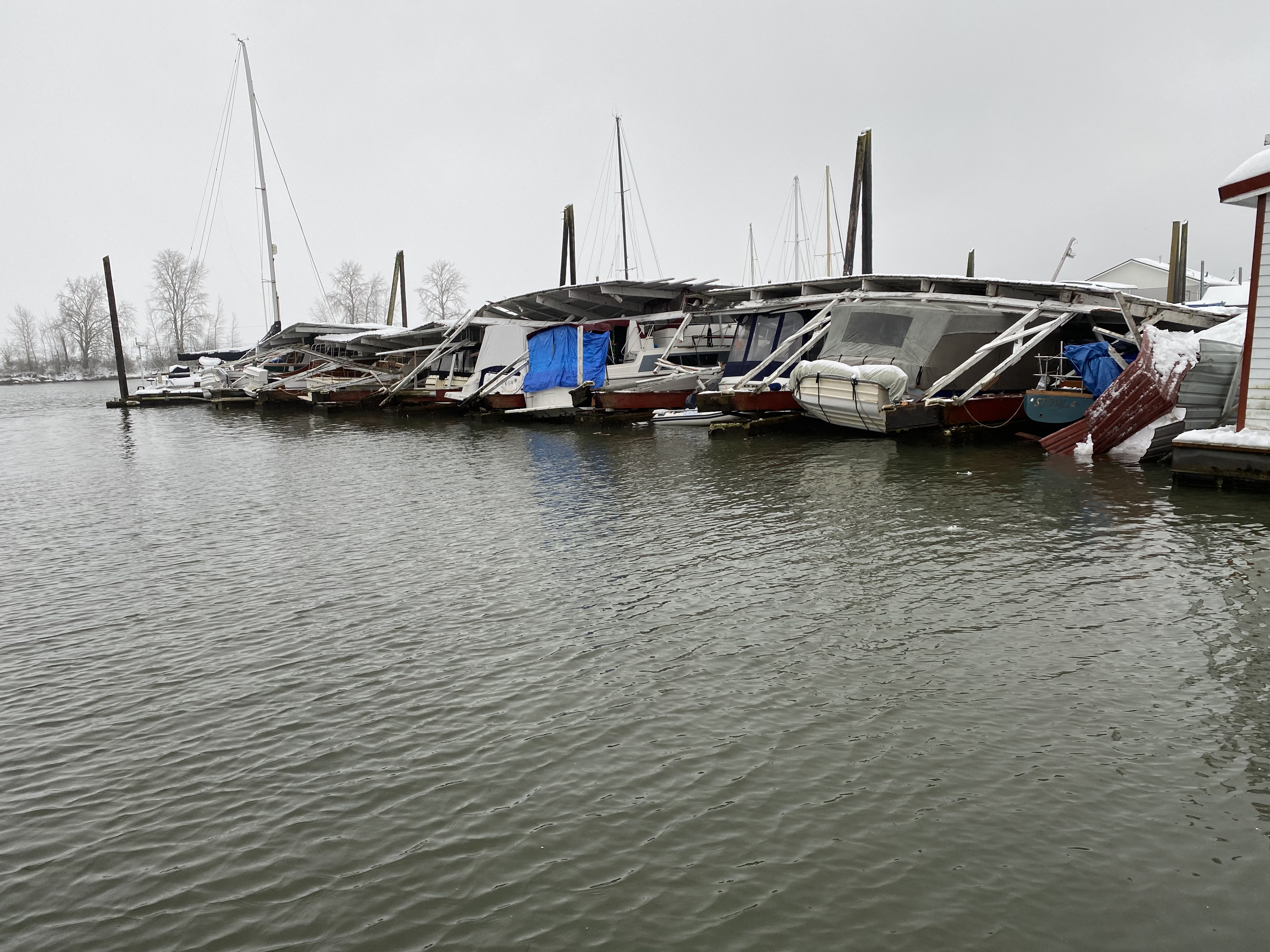 Scappoose Fire District responded to the 50000 block of Dike road to assist one of our local moorages today (2/14/2021). Due to the significant snow and ice loading from this past weather event, structural collapse occurred with the awnings that covered the boats in this picture.
