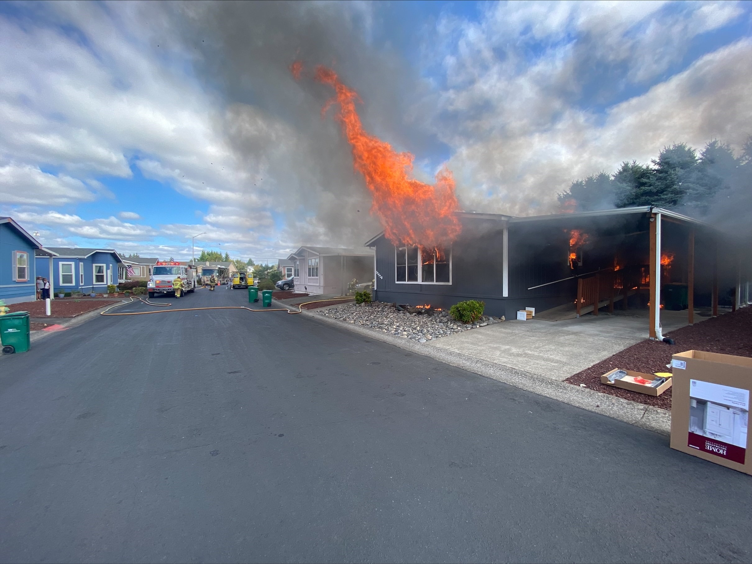 Scappoose Fire District responded to a residential structure fire in the 51000 block of SE 6th street in the Spring Lake Community this morning. The fire was called in at 11:54 AM, and we arrived in 6 minutes to a fire that was spreading quickly inside the house. The fire was deemed under control in 39 minutes.
