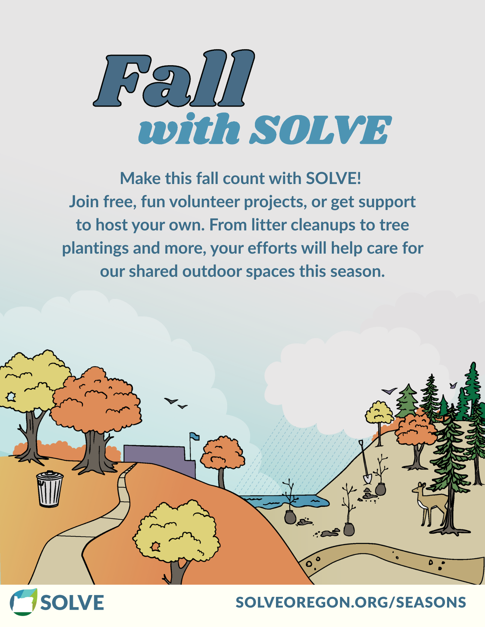 SOLVE invites individuals, families, schools, and businesses to take part in Fall with SOLVE by signing up for a project, hosting a cleanup, or supporting restoration efforts. Whether joining solo or with friends, family, or coworkers, every action helps protect waterways, restore habitats, and strengthen communities.