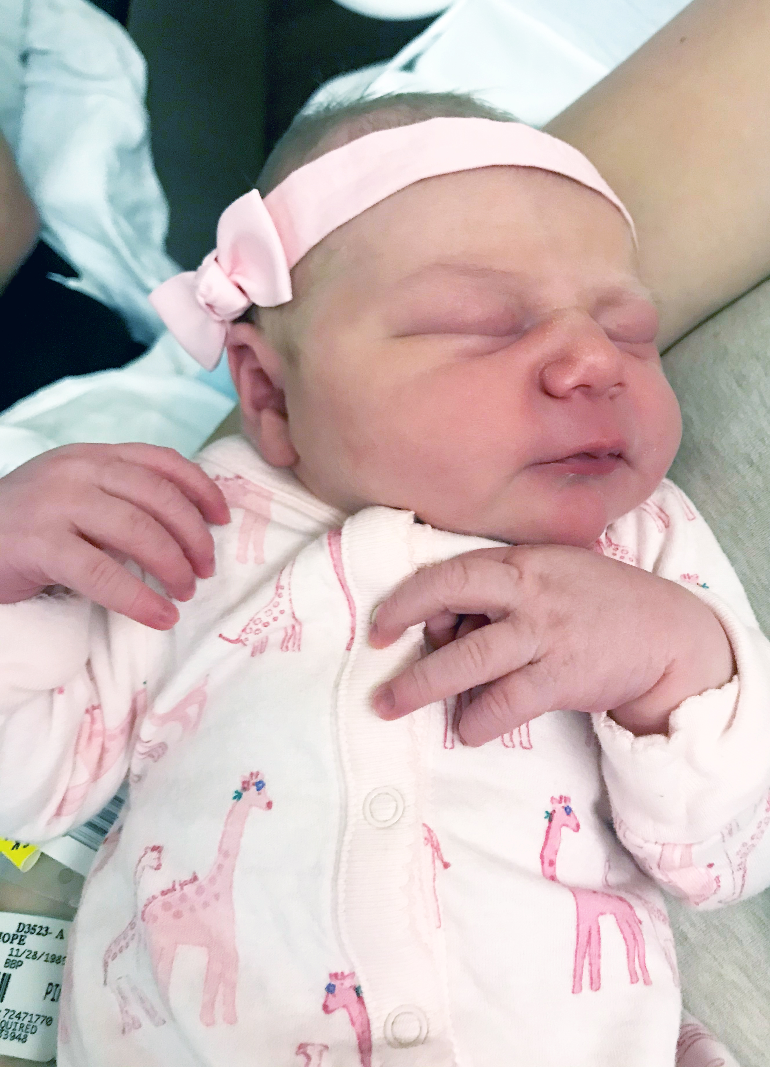 Sophie’s middle name comes from both sides — after Justin’s great granddad, Max, and Hope’s grandmother, Maxine. Hence, the two XXs. She’ll go home with a “first baby” gift basket — much larger than her 7 pounds, 9 ounces — filled with toys, supplies, coupons and best wishes from the FBC staff.