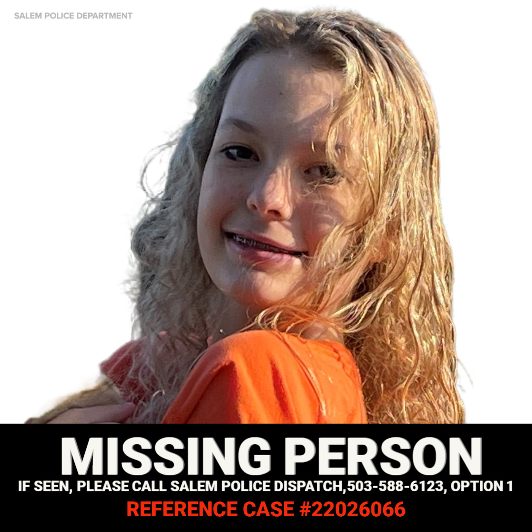 Salem, Ore. — The Salem Police Department is asking for the public’s assistance in locating a Salem teenager reported missing today, November 24, 2022, shortly before 6:00 a.m.
