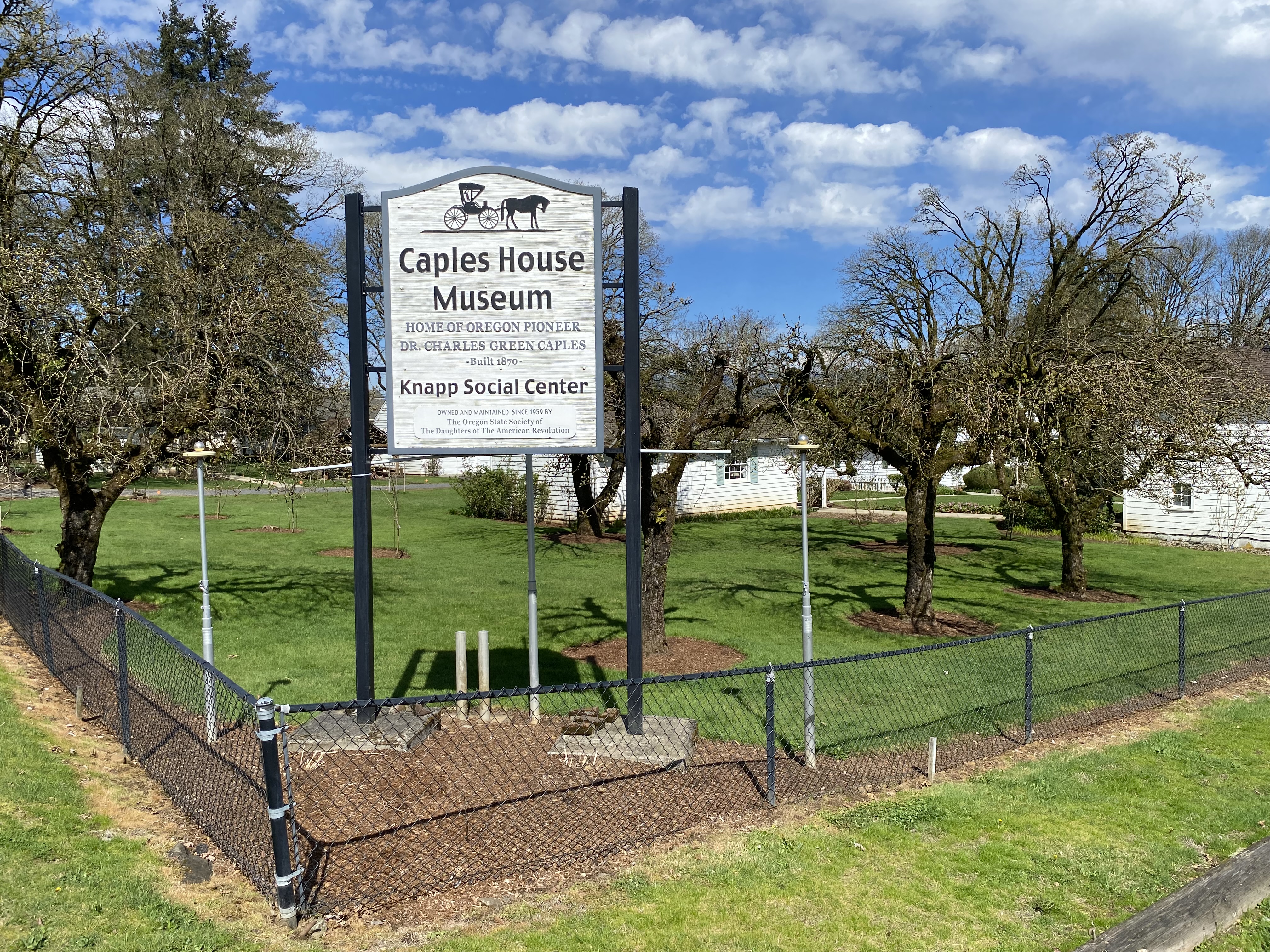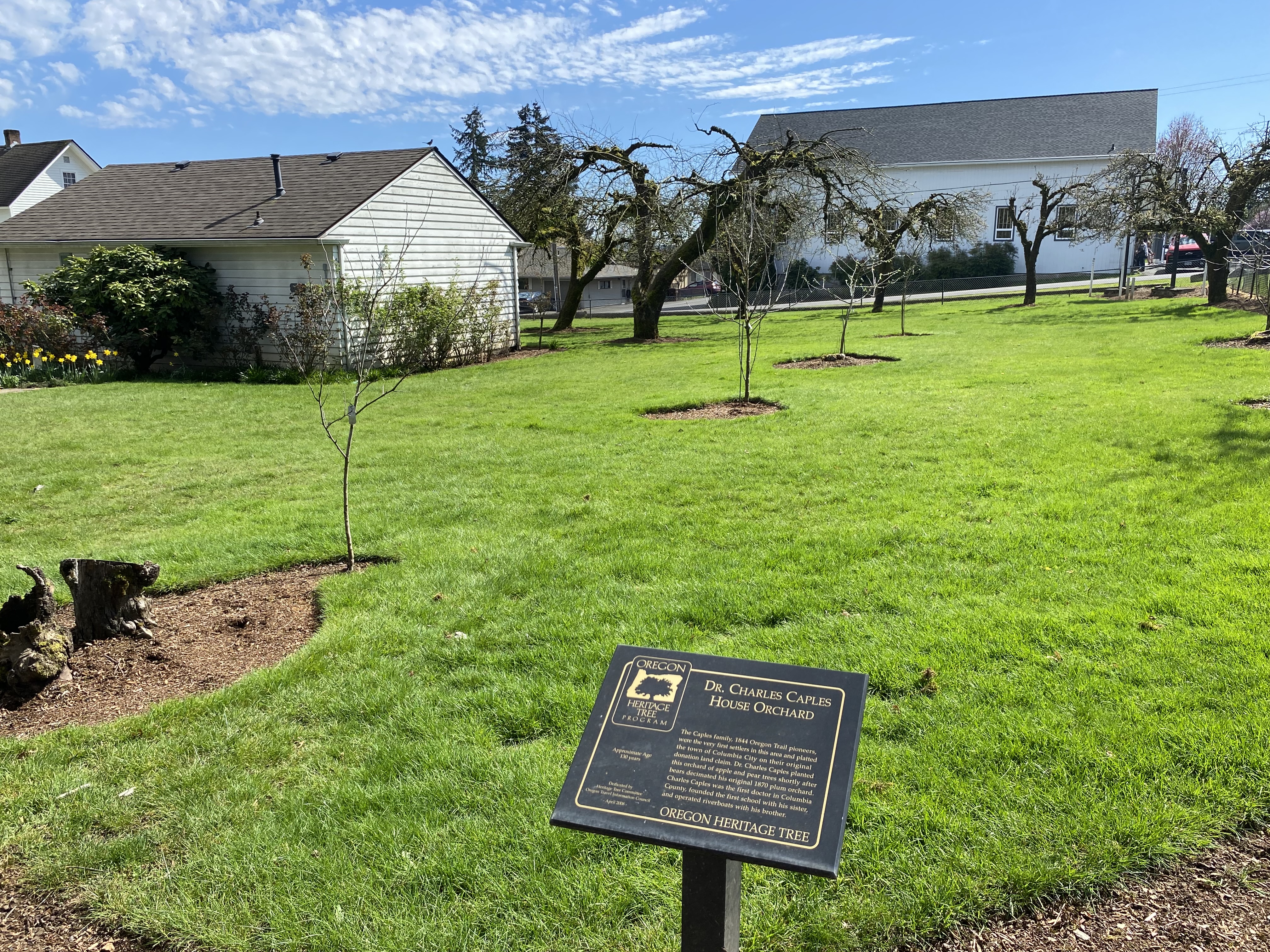 Dr. Charles Caples House Orchard in Columbia City: The Caples family, 1844 Oregon Trail pioneers, were the very first settlers in this area and platted the town of Columbia City on their original donation land claim. Dr. Charles Caples planted this orchard of apple and pear trees shortly after bears decimated his original 1870 plum orchard. Charles Caples was the first doctor in Columbia County, founded the first school with his sister, and operated riverboats with his brother.