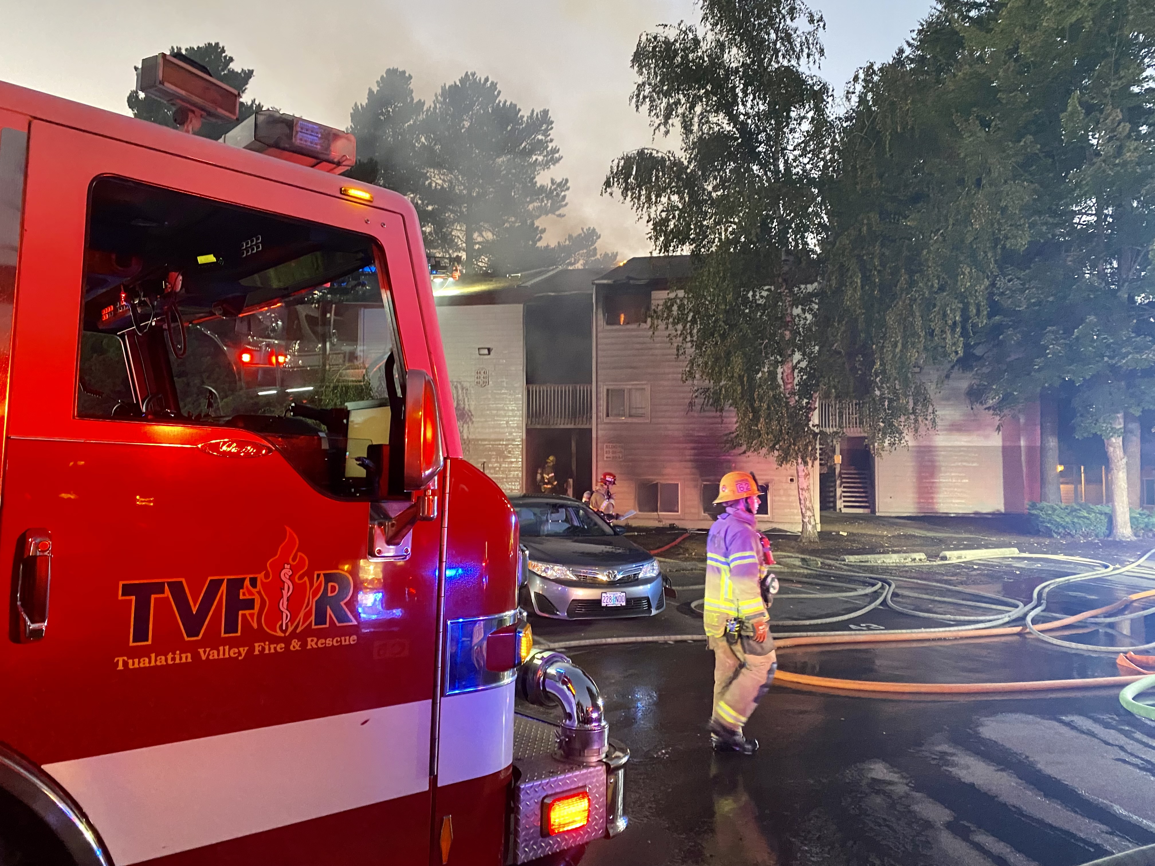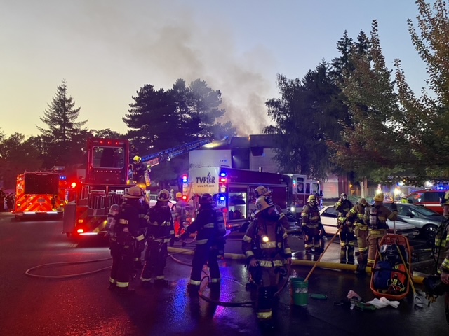 Washington County Sheriff’s Office deputies were first on scene and assisted with evacuating residents in nearby units. First-arriving crews from TVF&R found heavy fire in the complex and stairwell. They initiated aggressive fire attack measures and searched the involved units. The incident was then upgraded to a second alarm to bring in additional crews to help get the quickly moving and challenging blaze under control.