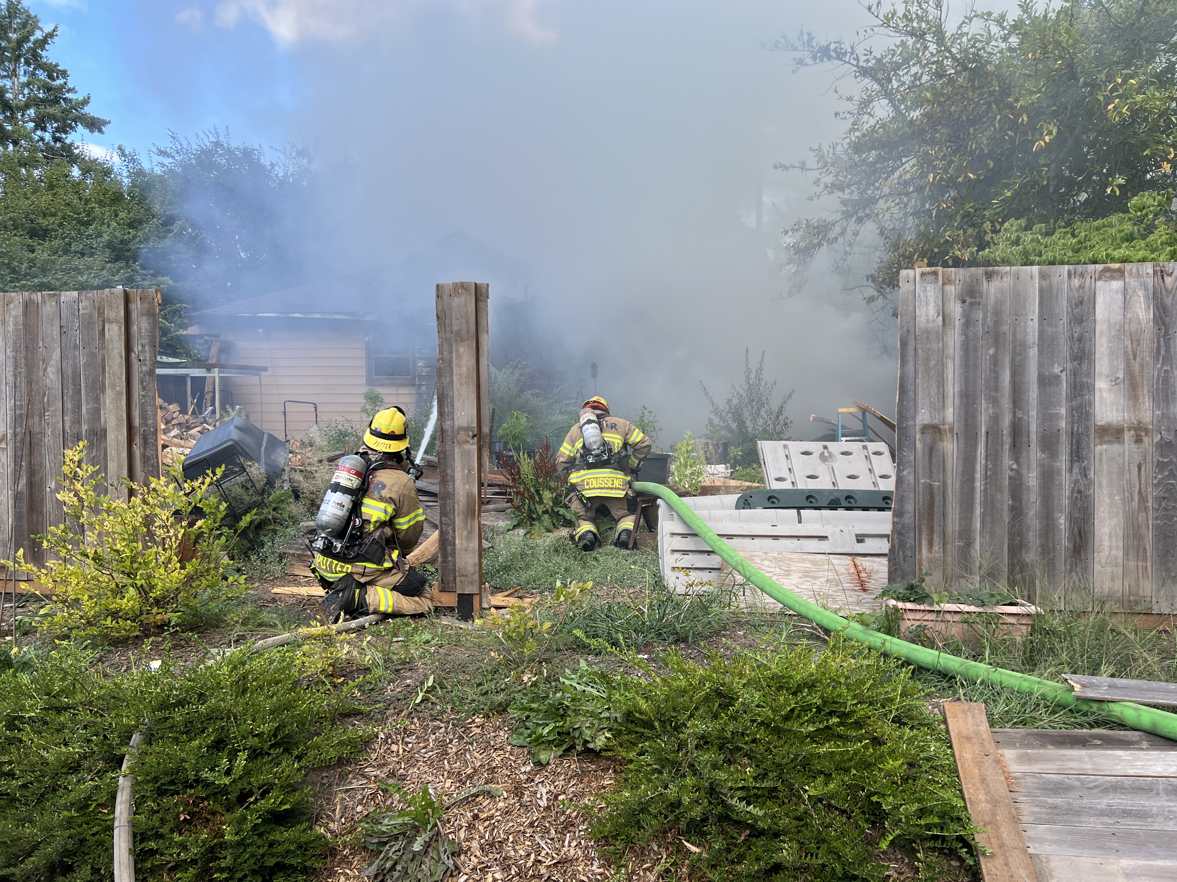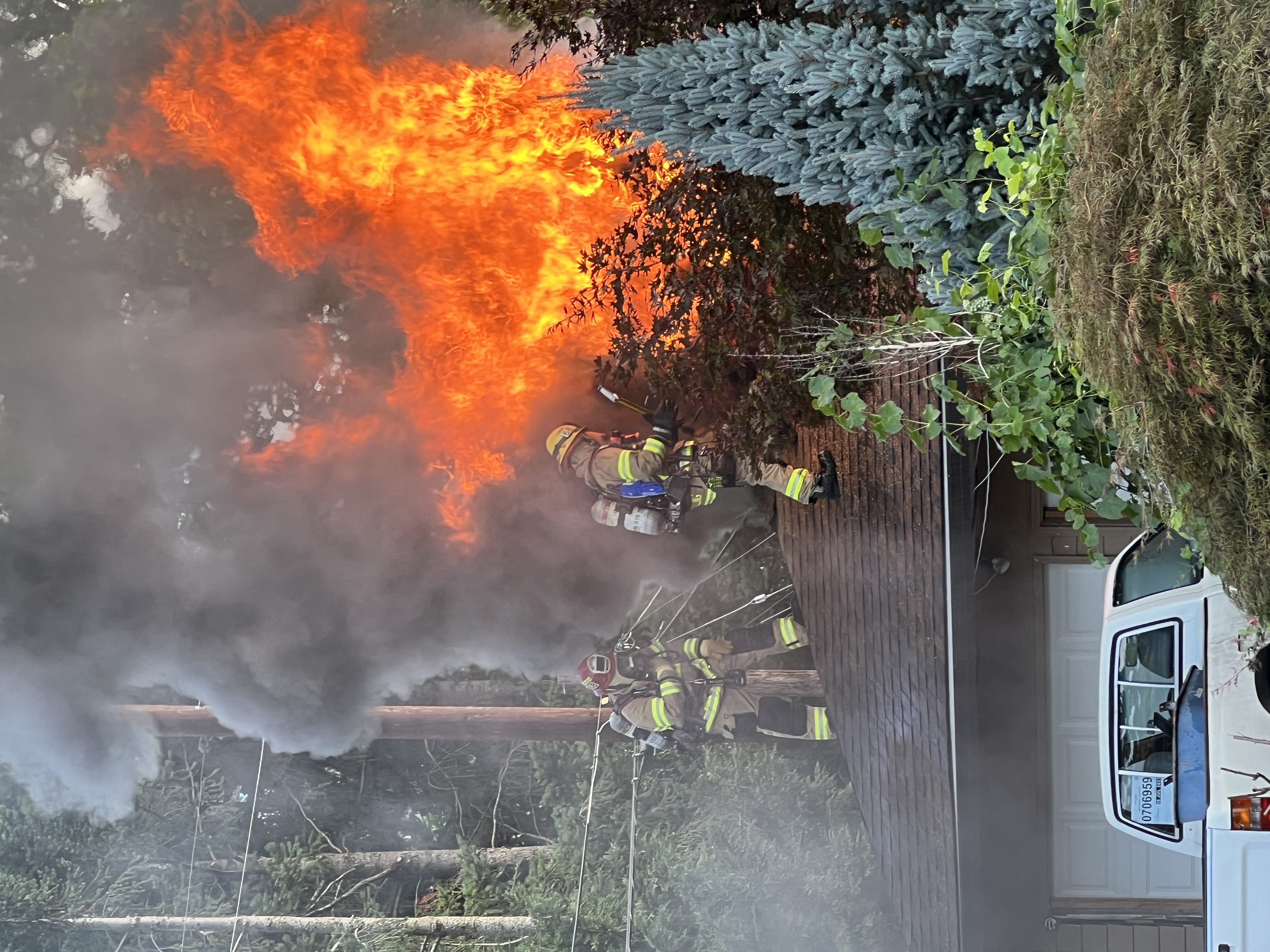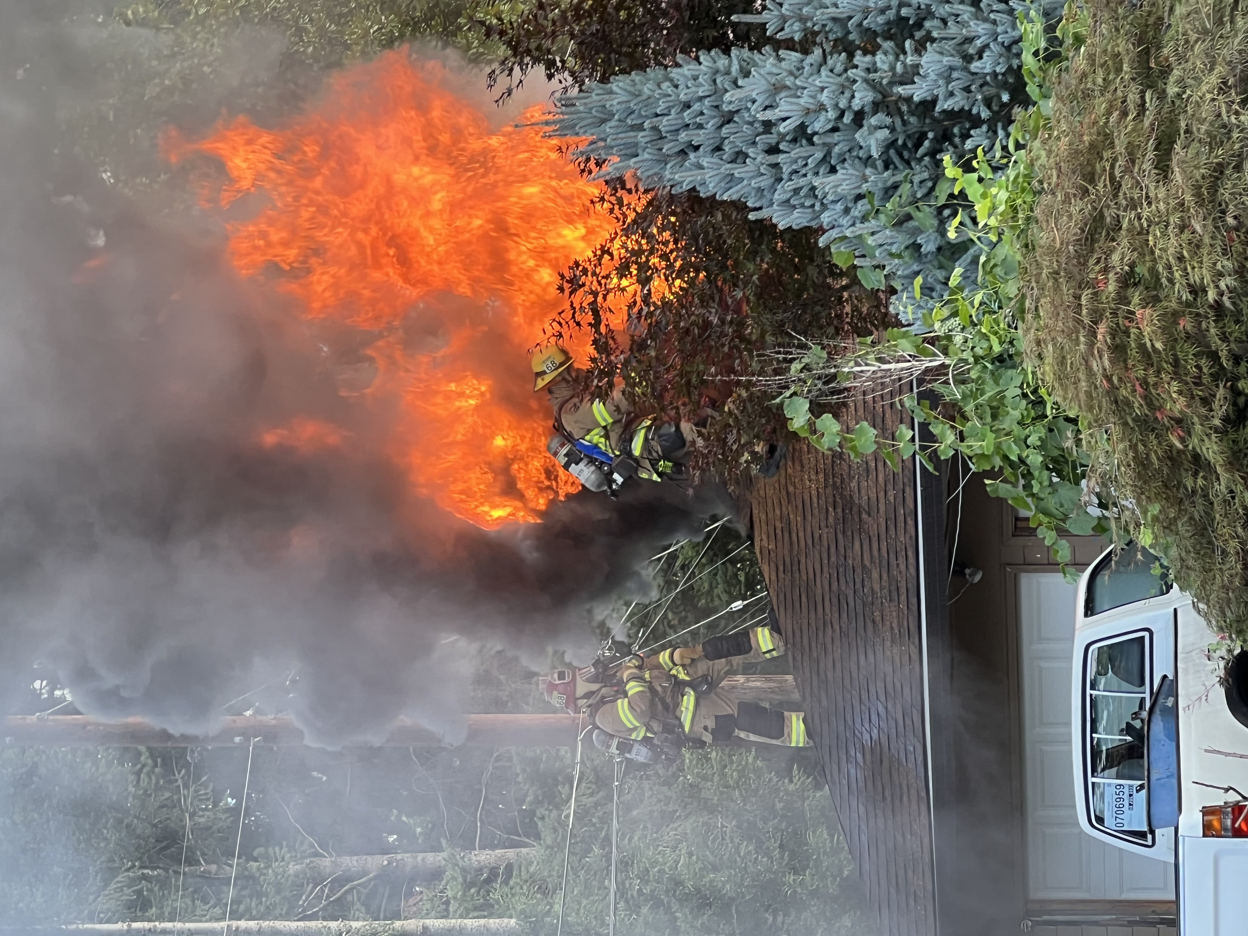Firefighters quickly initiated a search of the home for occupants and fought the fire that spread to the side of an adjacent house. Firefighters split into two teams working to extinguish the fire in both homes while continuing the search of both residences for any occupants. Firefighters from Portland Fire & Rescue assisted on scene. Crews worked to contain the fire and prevented it from spreading to nearby trees and brush while also contending with a downed powerline.
