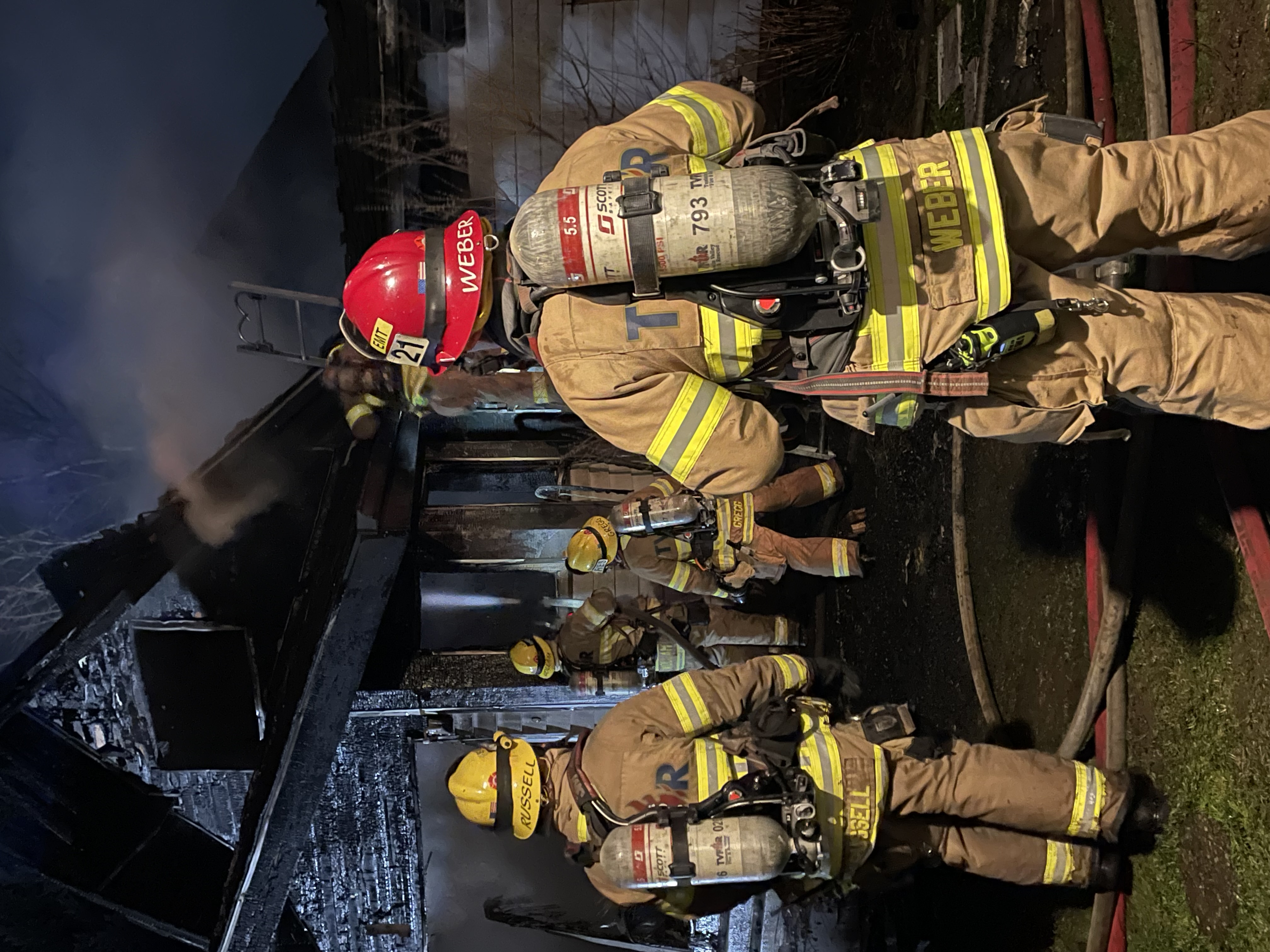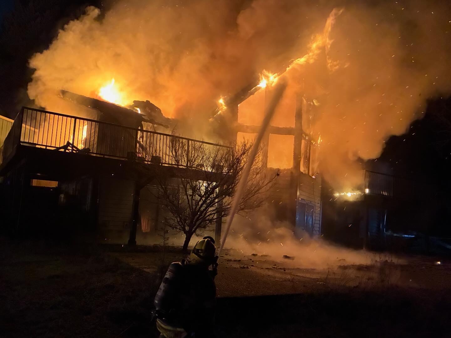 First-arriving units found the residence fully involved in fire, with flames venting from all windows on all sides of the structure. Due to the lack of fire hydrants in the area, crews initiated a water shuttle operation using water tenders to provide a sustained supply for suppression efforts. Access to the scene was also challenged by a long, narrow driveway extending nearly a half mile. A second alarm was requested right away to bring additional firefighters and apparatus to the scene due to these challenging conditions.