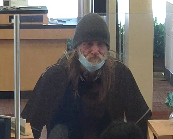 Two photos of the suspect are attached here. He is described as a white man in his 50’s with “dirty blonde” shoulder length hair and a goatee. He was wearing a dark gray beanie and black hoodie with white piping.