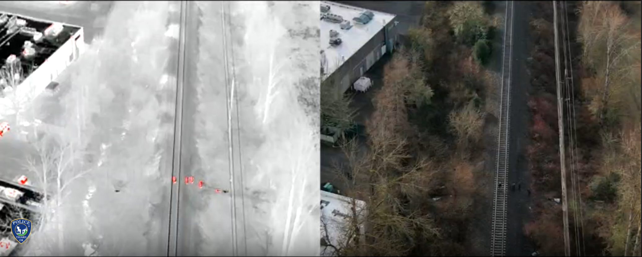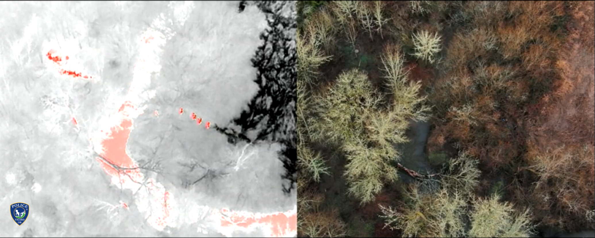The attached photos show how thermal imaging from a drone helped direct efforts in the search, as officers searched through trees, bushes, camps, debris and areas along the creek.