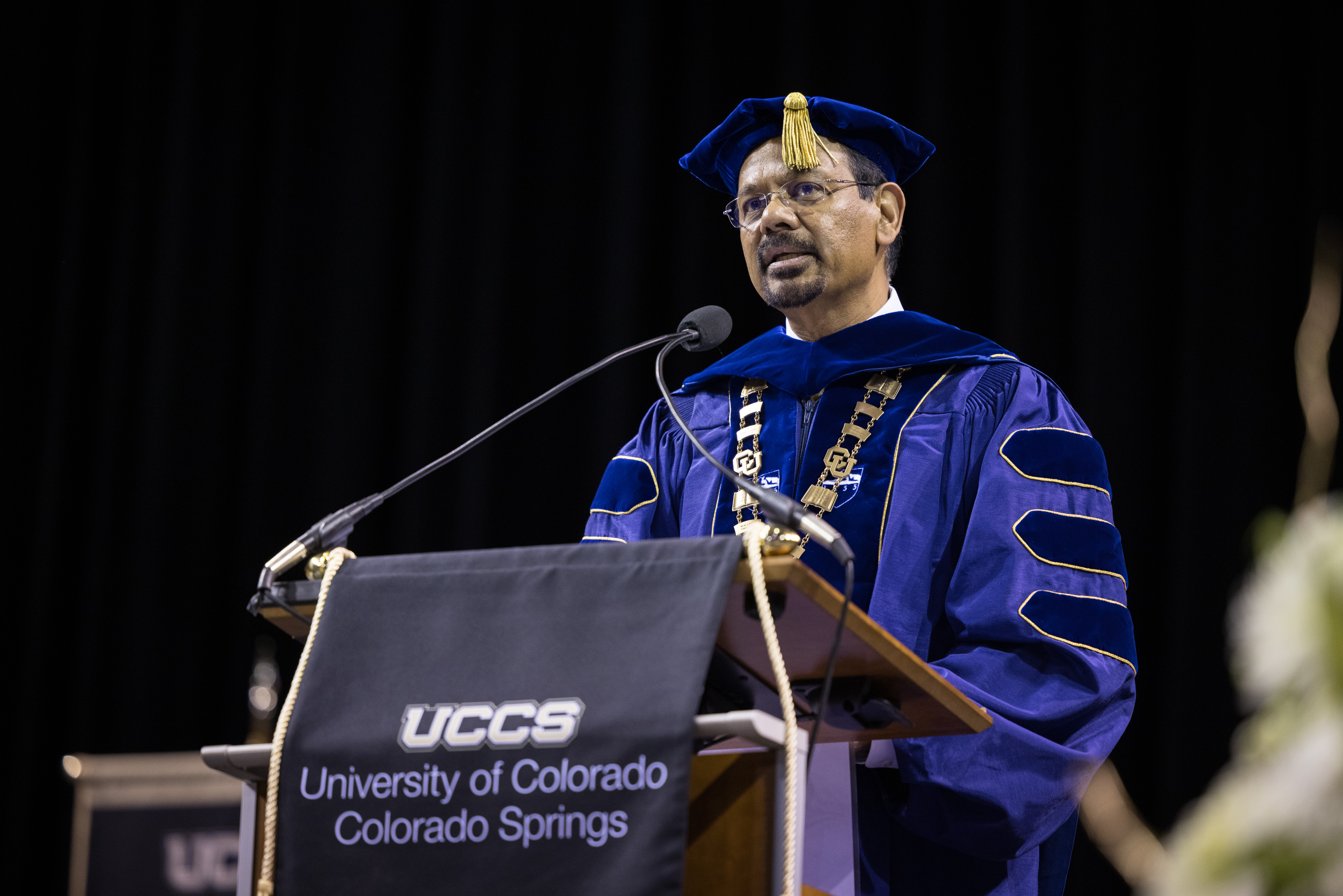 Venkat Reddy, Chancellor of UCCS; Todd Saliman, President of the University of Colorado system; and this year’s Student Achievement Award winners each shared words of wisdom with the new graduates.